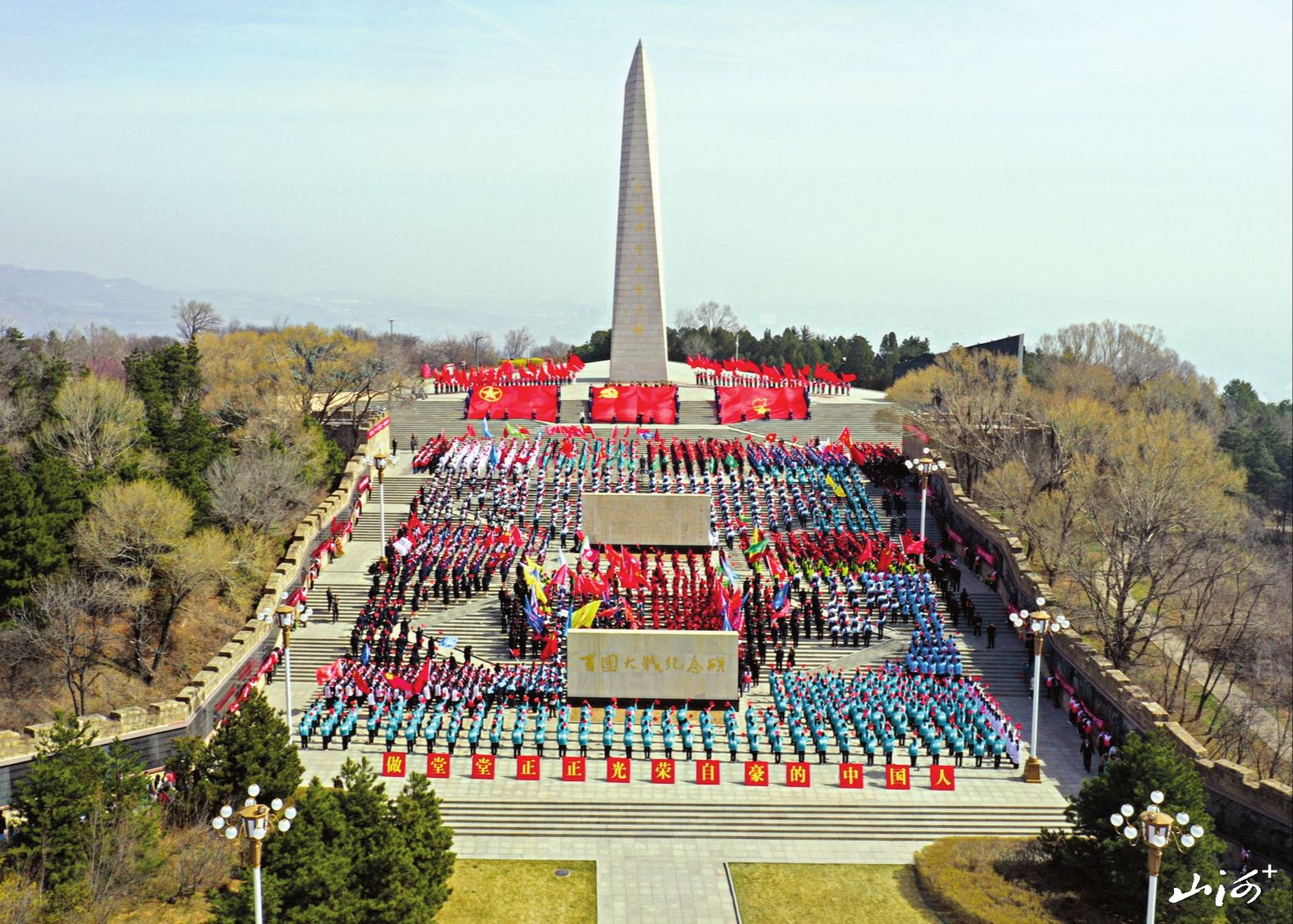 山西晚报·山河+讯 清明时节的狮脑山松柏苍翠,百团大战纪念碑巍然矗立。4月2日上午,在清明节来临之际,阳泉市开展“做堂堂正正、光荣自豪的中国人”大中小学生同上一堂思政课活动。来自全市多所学校约2000名师生徒步来到这里,在纪念碑前接受了一场深刻的爱国主义教育洗礼。