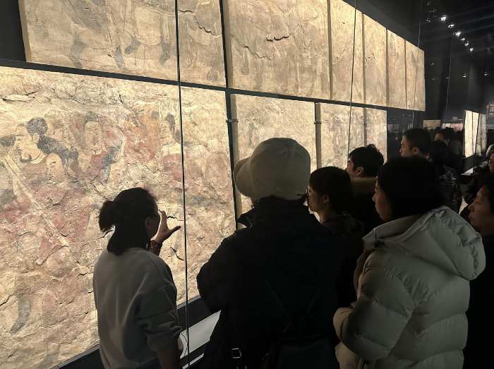 北齐壁画博物馆内,游客们围在导游身边仔细聆听讲解。钱琪莹摄