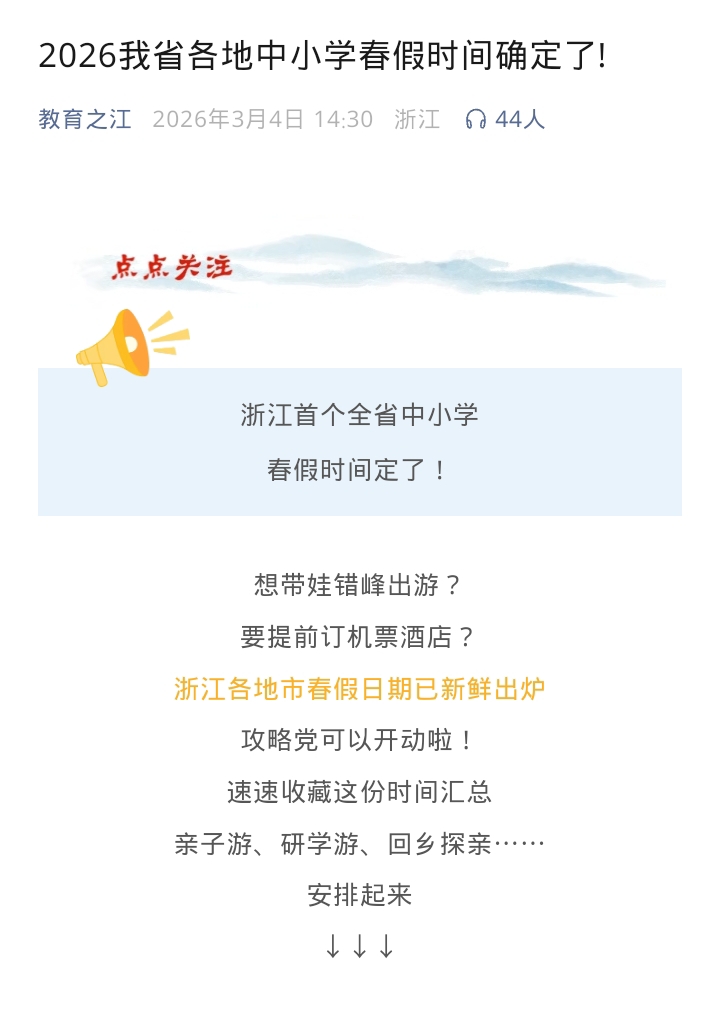 3月4日,浙江省教育厅公布2026浙江各地中小学春假时间:绍兴市的春假时间为4月1日至3日;金华市和杭州市的淳安县、建德市为4月2日至3日和4月7日;宁波市、嘉兴市、衢州市、台州市,以及杭州市的上城区、拱墅区、西湖区、滨江区、钱塘区、萧山区、余杭区、临平区、富阳区、临安区为4月28日至30日;杭州市的桐庐县、温州市、湖州市、丽水市等为4月29日至30日和5月6日。