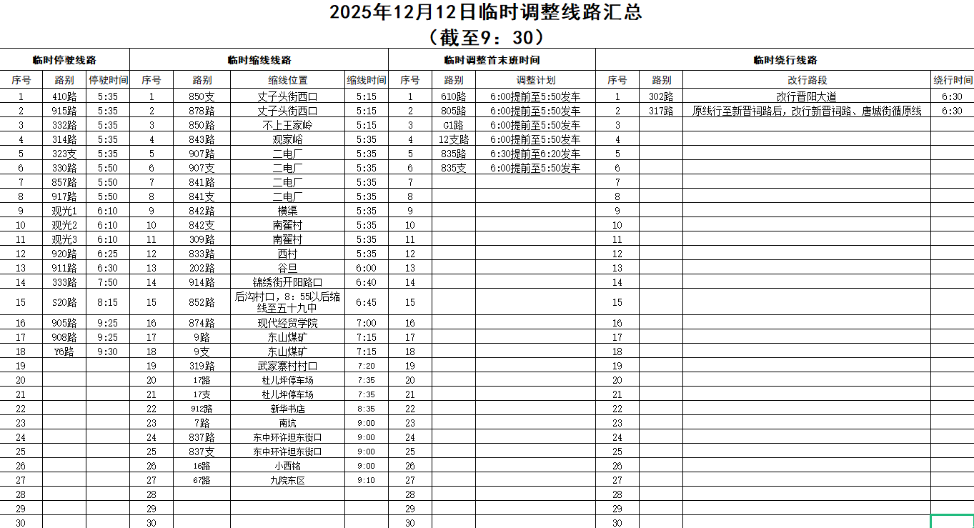 入冬后的首场降雪如约而至,受降雪影响,截至12日9时30分,太原公交停驶线路增至18条,缩线运行线路增至27条。具体如下: