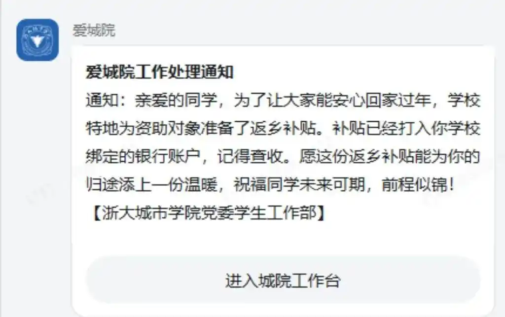 据该校1月19日发布的推文《返乡补贴!专车送站!城院,超暖的!》介绍,此次补贴是学校“数智校园”建设的重要成果之一。学校通过大数据动态分析,结合学生饭卡消费记录及其他日常消费数据,精准识别出有实际困难的学生群体。其中,省外学生500元、省内学生200元的补贴标准,基本可覆盖从西北戈壁到浙南山区的常规交通费用。
