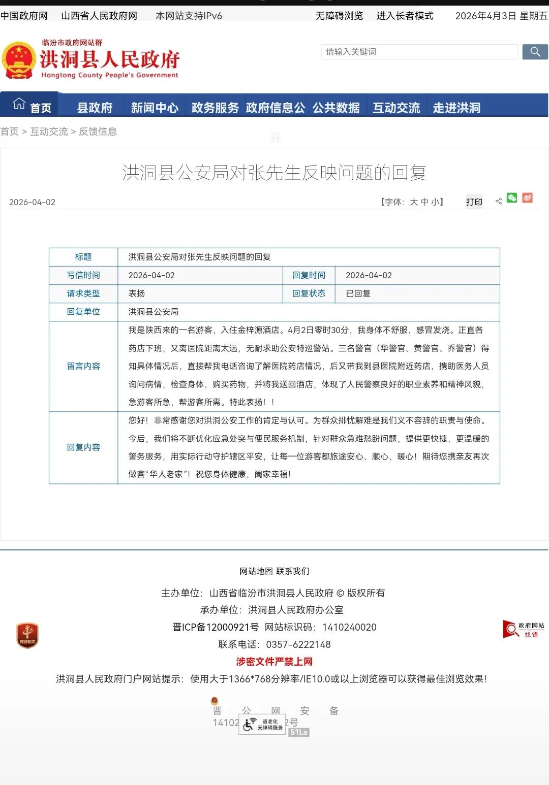 山西晚报·山河+讯  “急游客所急,帮游客所需。特此表扬!”4月2日,一封饱含感激之情的表扬信通过县长信箱工单,辗转送到洪洞县公安局,字里行间满是一名陕西游客的真挚谢意,也牵出了一段深夜街头的暖心故事,让春日里的洪洞多了一份温情。
