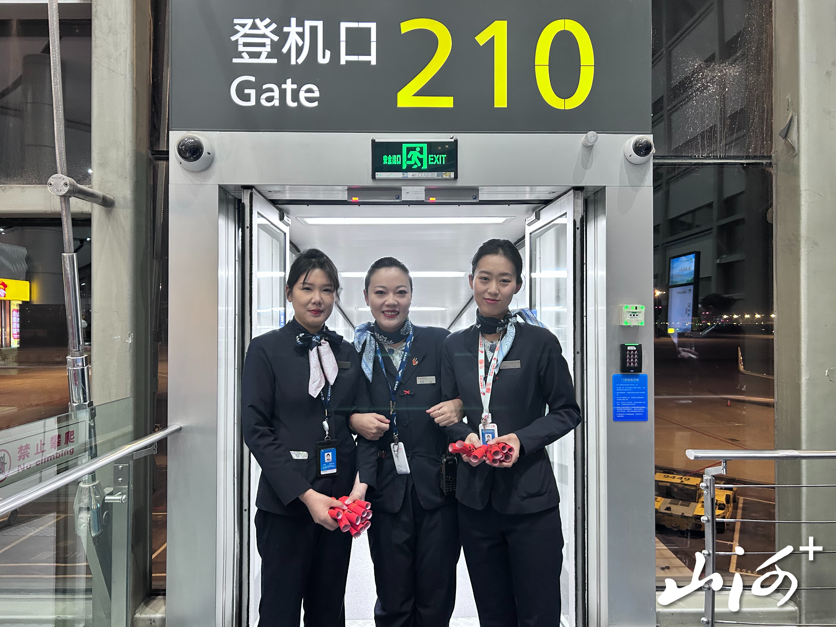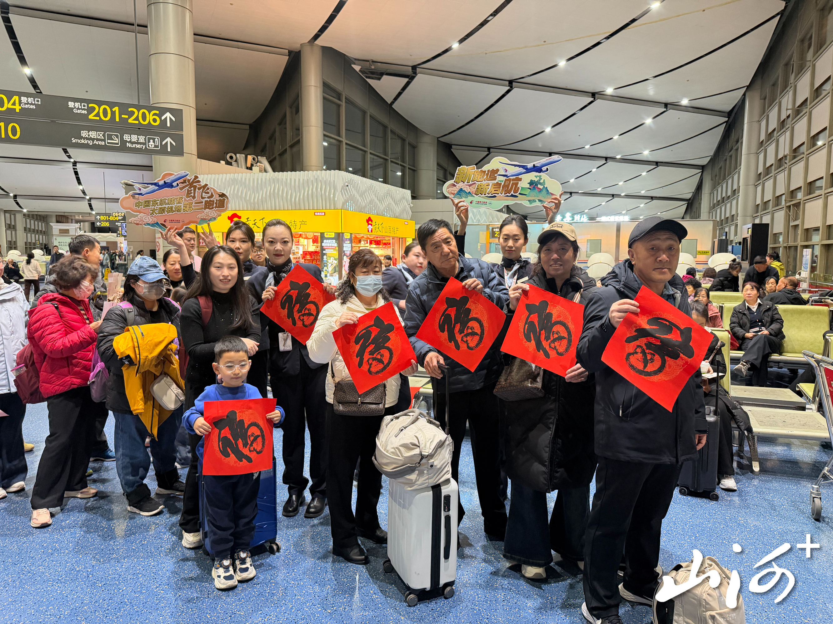 为庆祝这一历史时刻,东航在登机口举办了简洁而温馨的首航仪式。现场,东航与山西文化传媒中心共同为旅客送上了独特的庆祝礼物——由中国书法兰亭奖获得者王国柱先生题写的吉语对联与“福”字抱枕等。“出入平安”“吉祥如意”等祝福,既是对旅途的祝愿,也呼应着新跑道带来的新机遇。旅客欣然接受这份心意,纷纷合影留念,登机口洋溢着温暖喜悦的氛围。东航地服与乘务人员通过特殊广播,分别在空中与地面传递了这份喜悦。