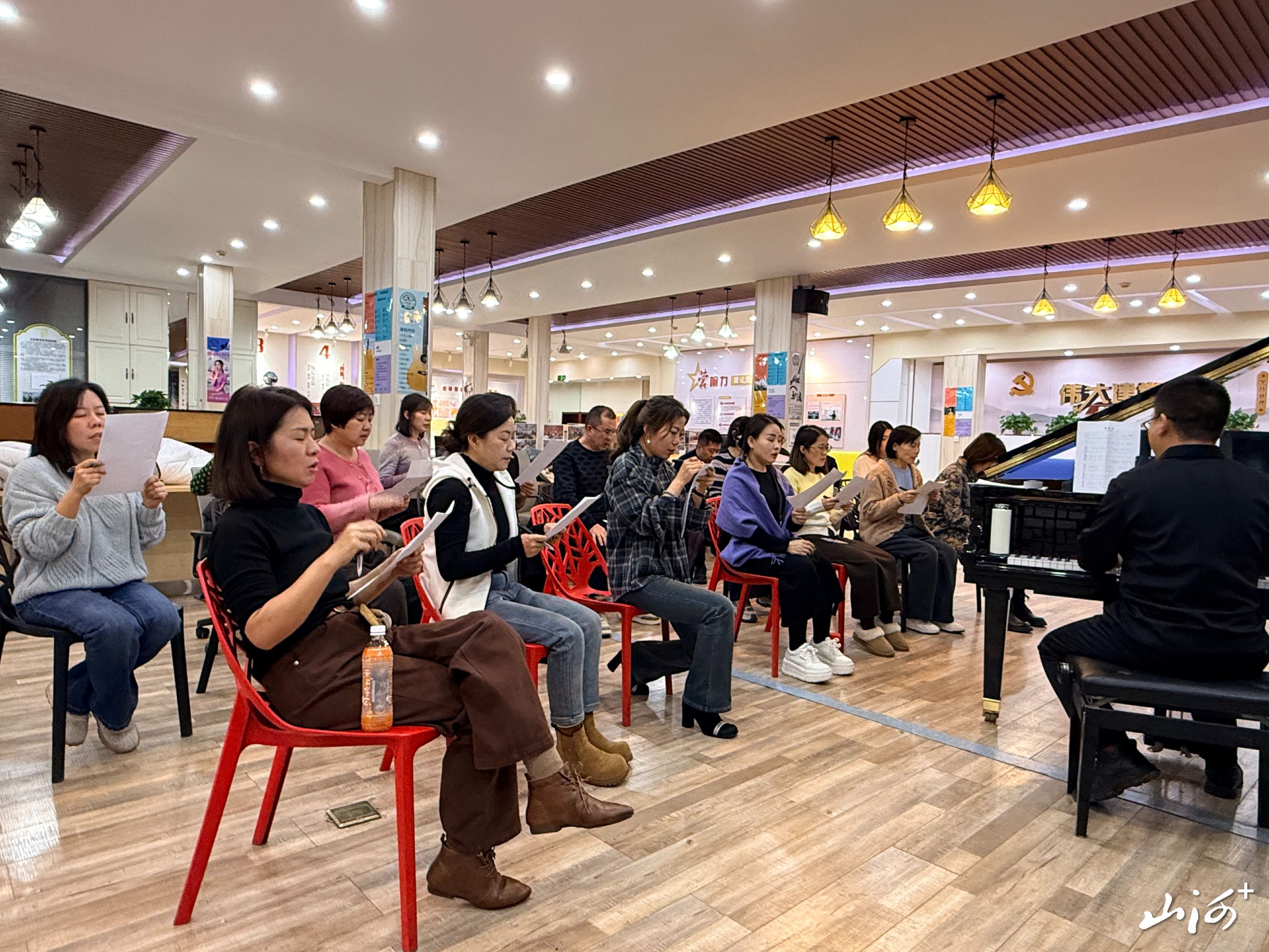居民在专业老师指导下学习合唱技巧。