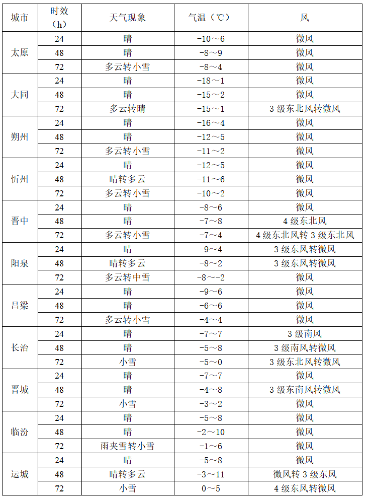 白天最高温:北部及中南部山区0℃到6℃,中南部其余地区能到6℃到11℃,午后会稍微暖和些;夜间最低温变化不大,高寒地区依旧是零下21℃左右,北中部和南部山区零下17℃到零下8℃,南部其余地区在零下8℃到1℃,整体还是偏冷,保暖不能松。