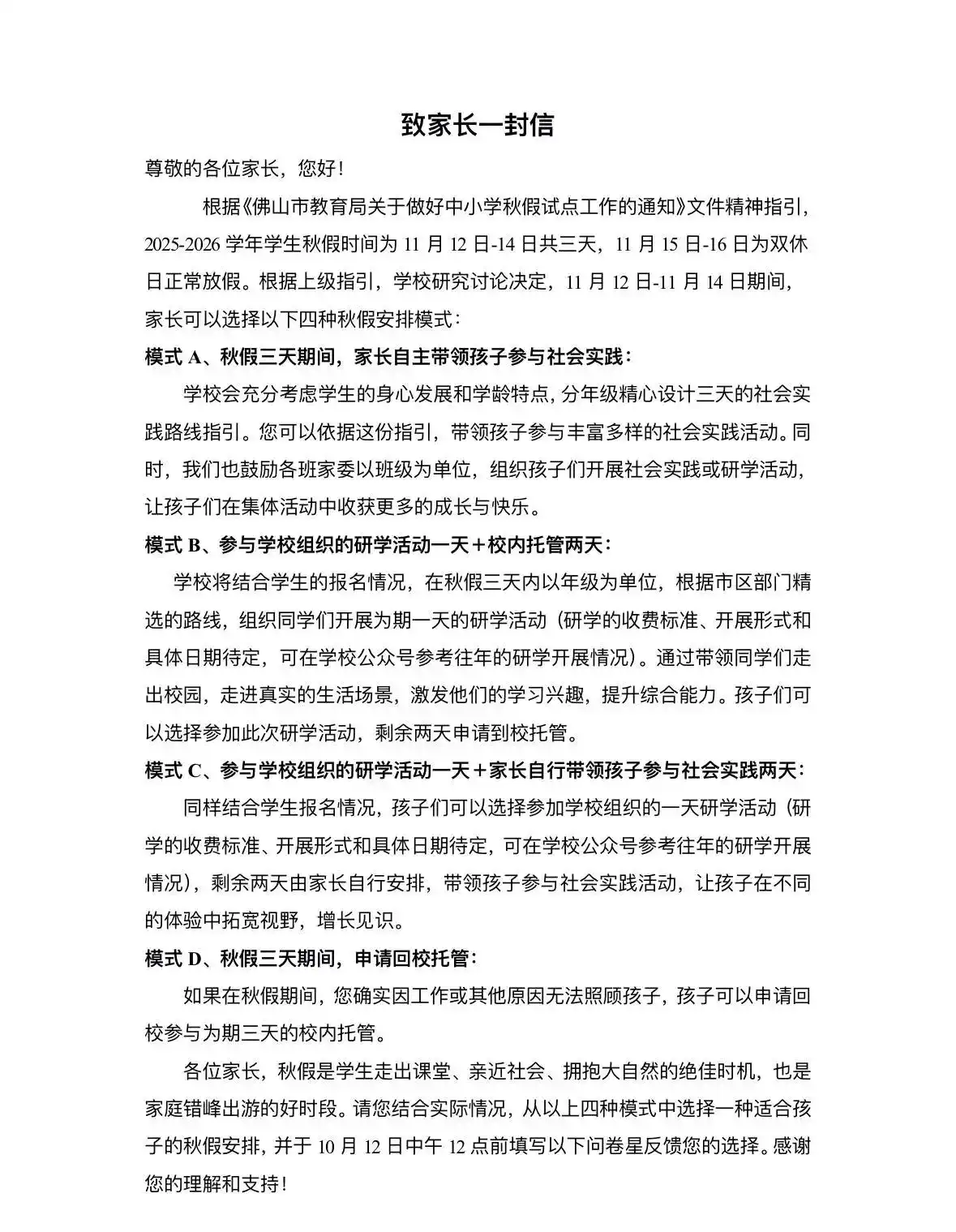 山西晚报·山河+记者根据各地教育部门发布的权威信息综合整理,广东佛山市明确,2025—2026学年秋假安排在11月12日至14日,共3天;春假安排在“五一”假期前后,共2天。市教育局已发布通知,将在全市义务教育学校开展春秋假试点。