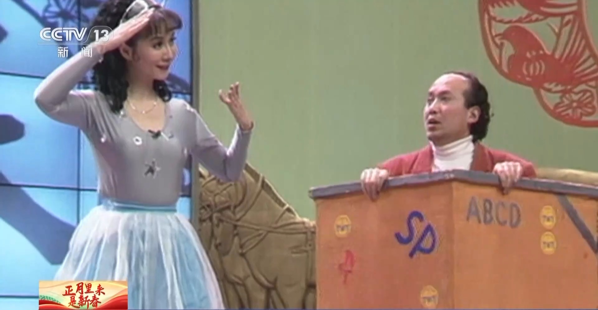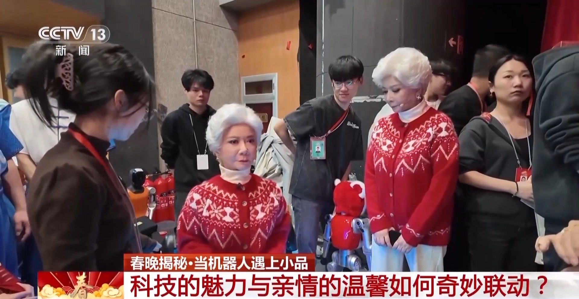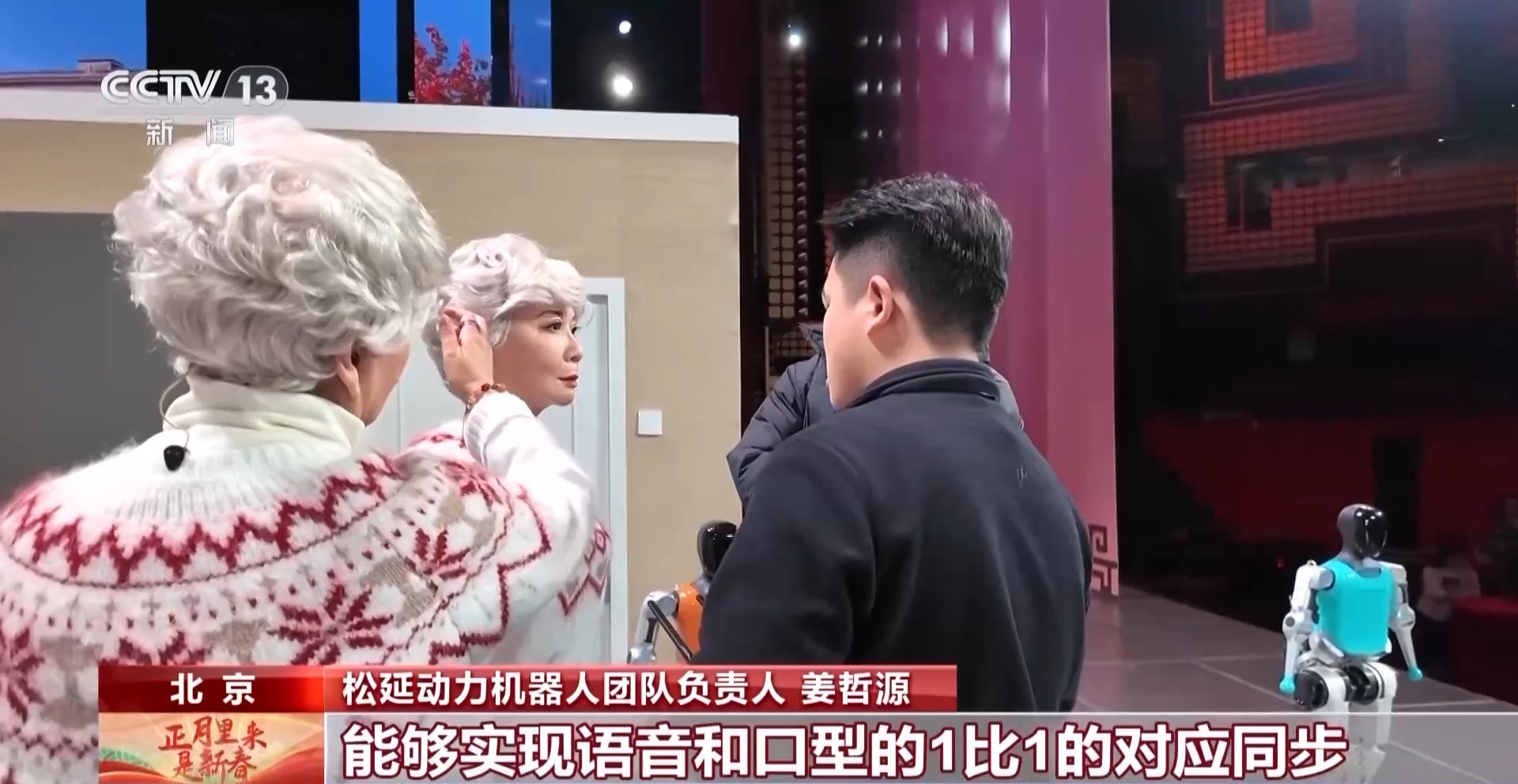 总台记者张河运:在我身边的这位,就是小品里出现的“假奶奶”,即便距离这么近,我都很难看出它和蔡明老师扮演的真奶奶有何不同,无论是发型、五官、妆造,甚至说话时面部的微表情都可以说是一模一样。