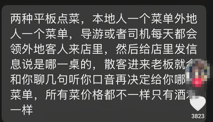 知情人士透露,该饭店长期使用两套电子菜单:本地顾客使用低价菜单,外地游客则被引导使用高价菜单。导游或司机带团到店后,会通过信息告知店方具体桌号,以便“精准定价”。对于散客,老板则通过交谈辨别口音,再决定提供哪一版菜单。