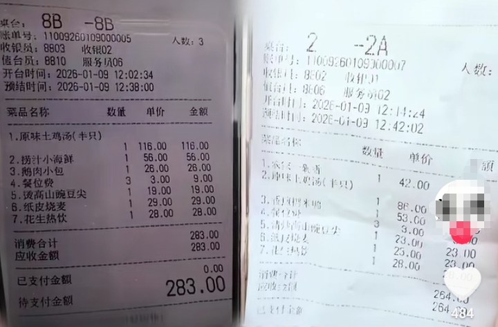 据网友发布的现场视频显示,两桌顾客分别操外地口音与重庆本地口音,在该饭店点选了几乎完全相同的菜品,但结账金额却明显不同。其中,“半只原味土鸡汤”一桌标价86元,另一桌则为116元,差价达30元;“会跳舞的虾”分别为79元和59元;“秘制叉烧肉”也出现53元与39元的价差。