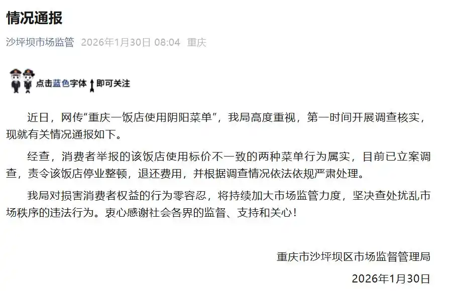 山西晚报·山河+讯 近日,一段关于重庆某饭店对外地游客与本地顾客实行不同菜品价格的视频在网络引发广泛关注。1月30日,重庆市沙坪坝区市场监督管理局发布情况通报,确认涉事饭店存在使用“阴阳菜单”的违法行为,已依法责令其停业整顿、退还相关费用,并将依法依规严肃处理。
