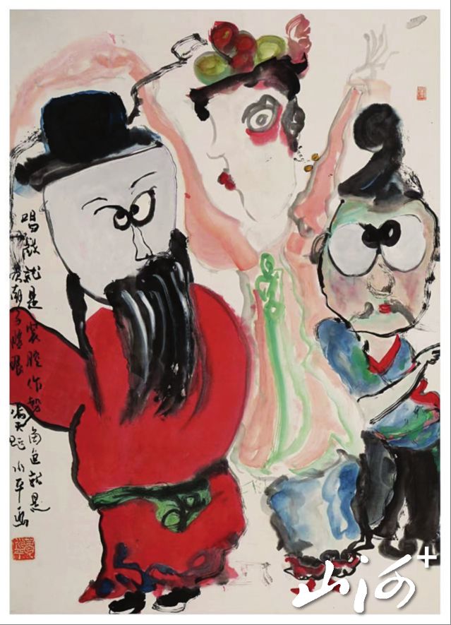 她早年随剧团常在乡间演戏。晋东南作为戏曲之乡,地方戏的韵律、程式、夸张的肢体语言与强烈的情感表达,深深浸入她的艺术血液,使她的绘画天然带有一种“古戏剧色彩”。画中人物的姿态,往往不像静态的造型,而更像舞台上的一个亮相、一个身段,充满了动态张力与叙事性暗示。人物与动物的造型与神态,被提炼、被夸张,如同戏曲脸谱与动作,直指性格与命运的核心,达到了“身心俱到,举手投足,能传神,扣心弦”的效果。这种戏剧感的融入,让她的民俗表达超越了简单的风情再现,升华为具有仪式感和象征性的个性化表达图式。