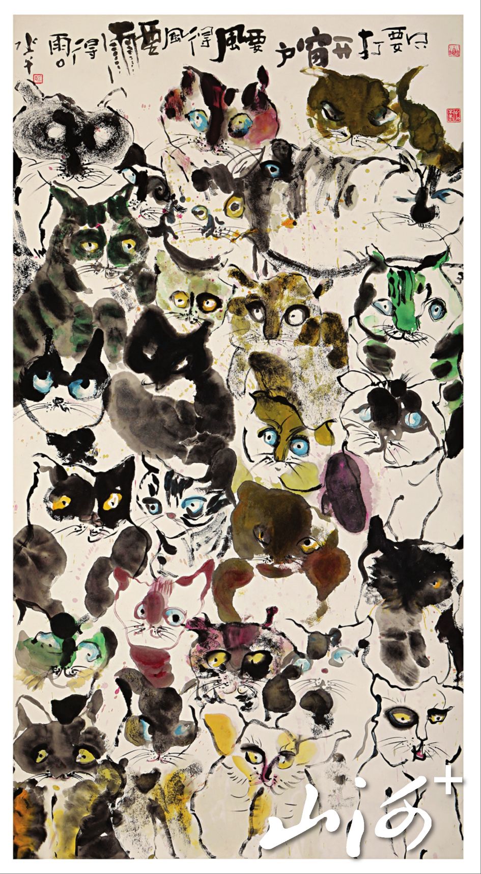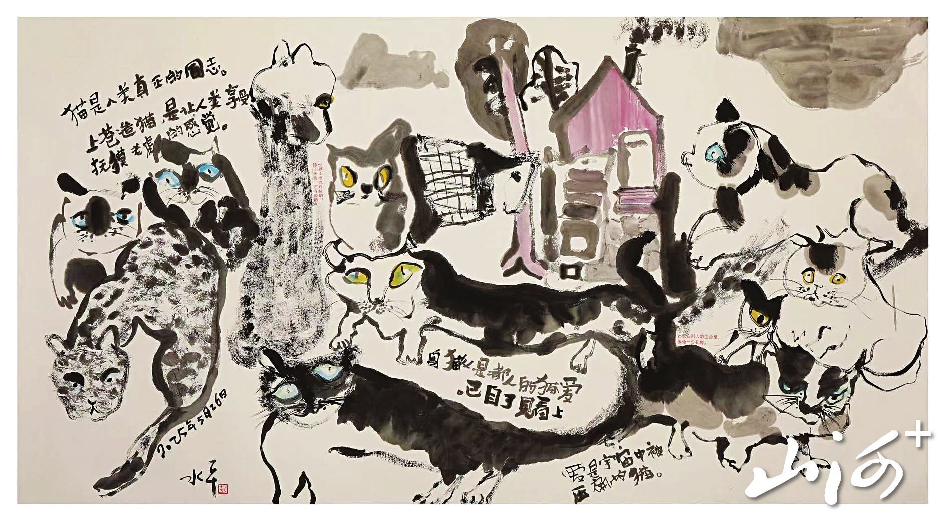 在葛水平的绘画题材中,“猫”占据了一个独特而耀眼的位置,形成了她极具个人标识的创作区间。她笔下的猫,绝非单纯的宠物写生,而是被高度人格化、象征化甚至神话化的艺术载体。她画中的猫,承载了人类复杂的情感与处境:相依与孤独、自由与漂泊、机心与天真、生存与战争。