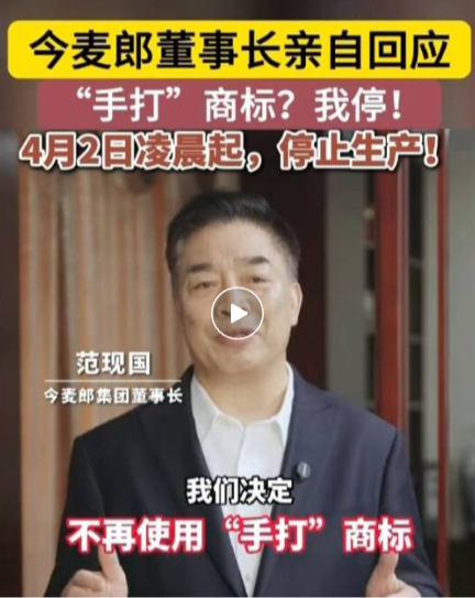 针对今麦郎“手打挂面”争议,4月1日,今麦郎集团创始人、董事长范现国发布视频称,“手打”商标是2006年注册,已经用了20年。为了避免给大家带来产品表述的困扰,决定不再使用“手打”商标。“我们决定不再使用‘手打’商标,从4月2日凌晨起,我们会立即停止生产所有带有‘手打’商标的产品。”