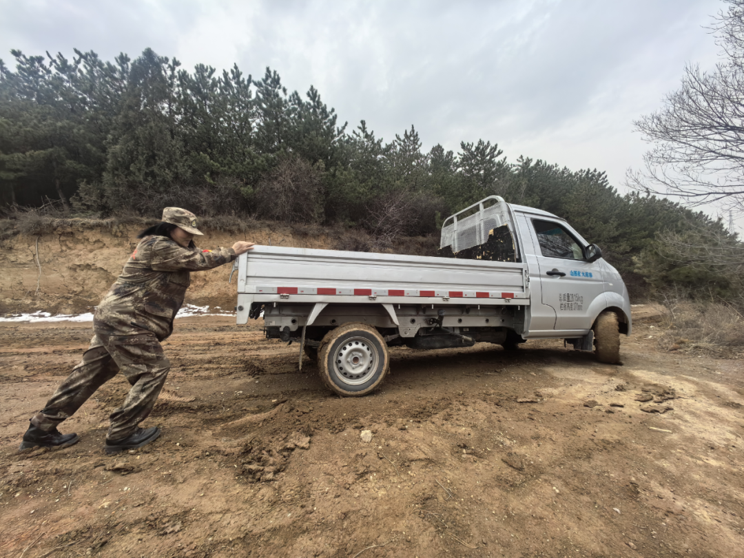 “得下去推一把。”张美德话音未落,郭俊花已经迅速下去推车,夫妻俩几经周折,才终于把车开到半山腰的平缓地带。