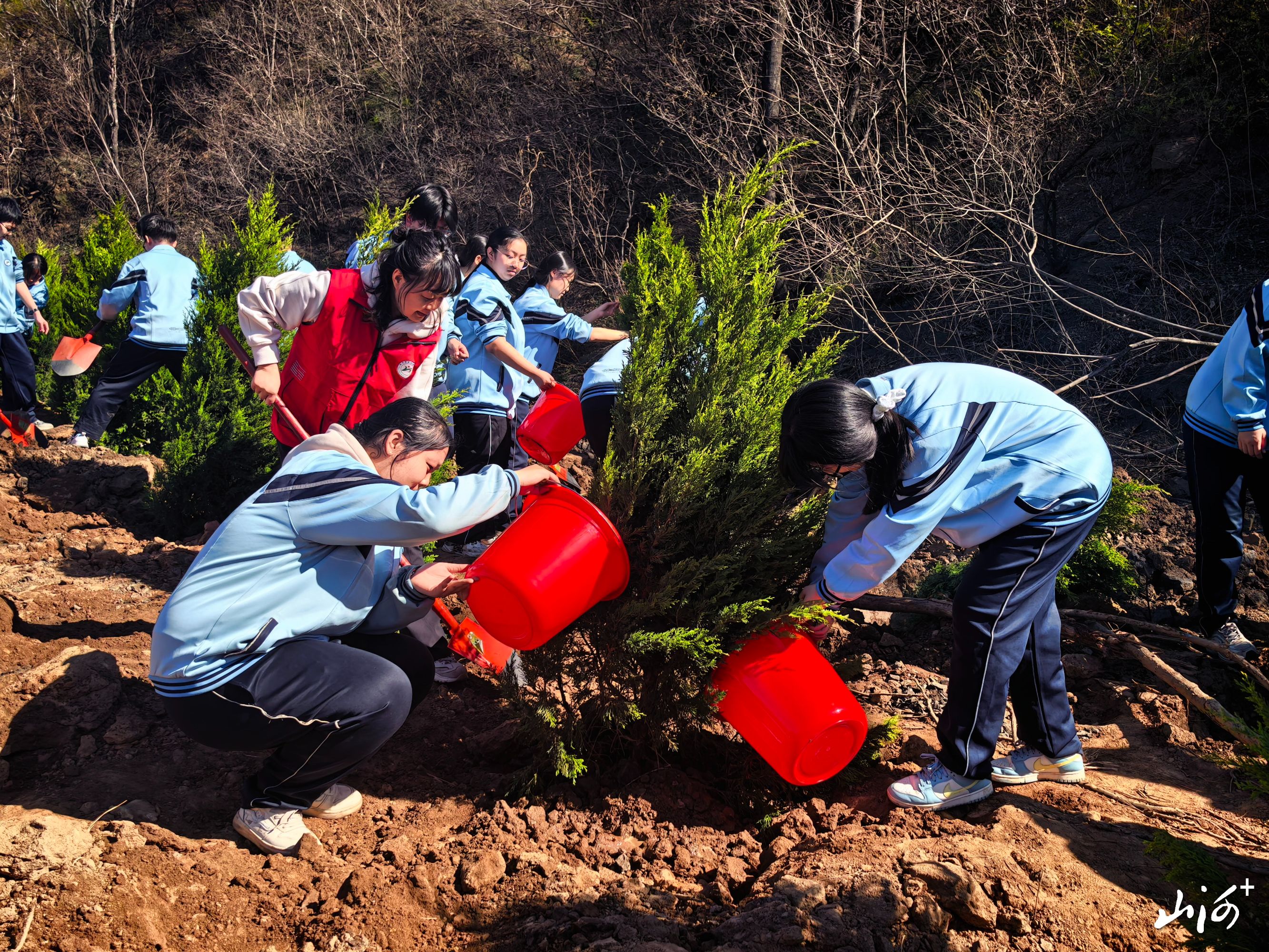 植树队伍中,阳泉市第十五中学的学生们格外引人注目。高二年级理科二班学生李菲凡一边为新栽下的侧柏浇水,一边兴奋地说:“以前只在课本中了解植树造林的意义,今天能和同学们一起亲手种下小树苗,特别有成就感。”