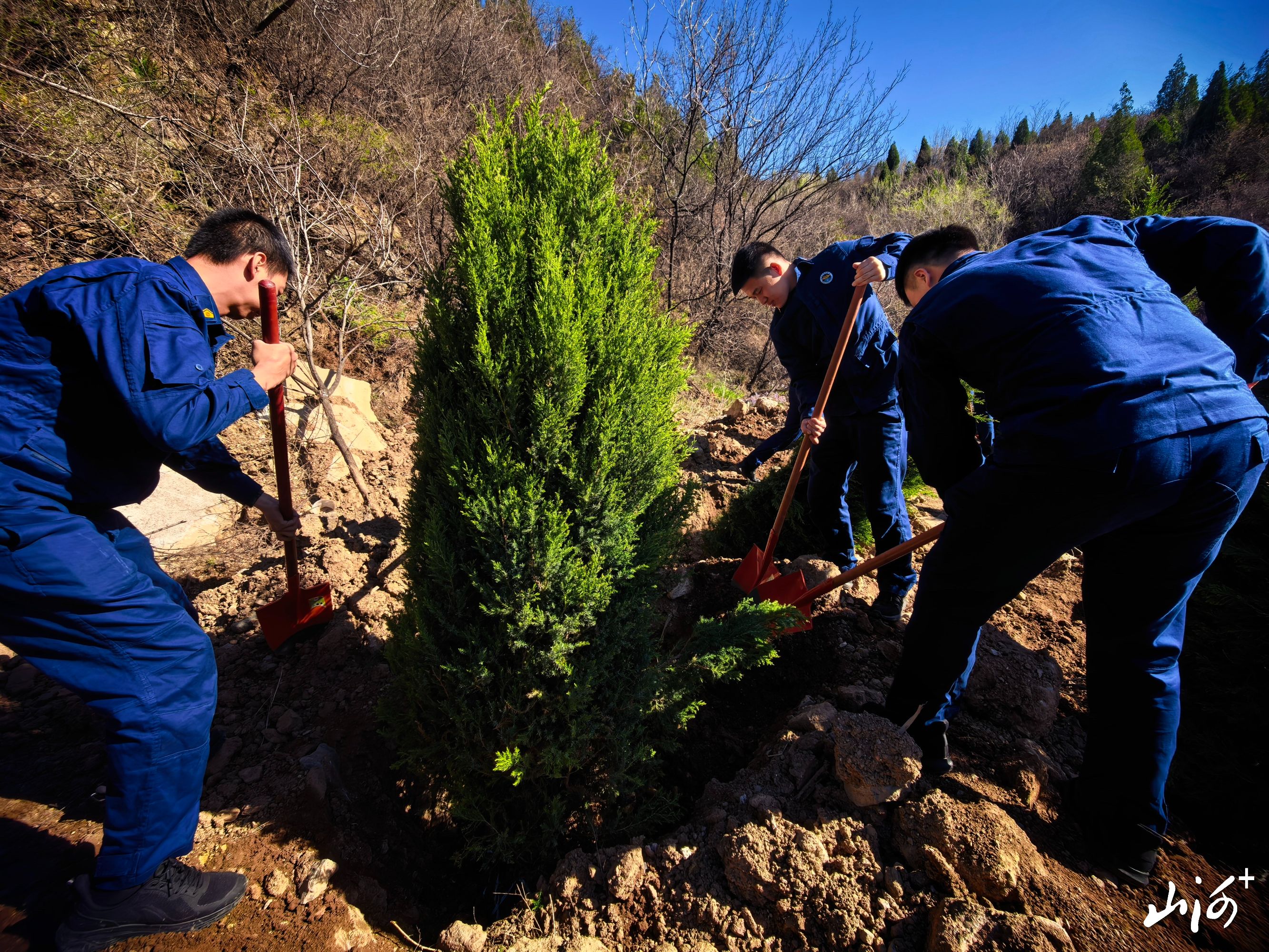 来自阳泉矿区四套班子领导、机关事业单位代表、青年志愿者、消防救援队员、矿区劳动模范、阳泉市第十五中学学生等300余人投身植绿护绿行动。大家三两一组、分工协作、挖坑、扶苗、培土、压实、浇水,井然有序。在技术人员指导下,每一步都严格按照栽植要求操作,确保苗木扎根生长、茁壮成长。