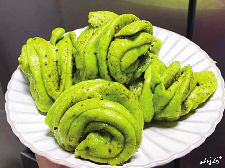 艾草洗干净焯水,焯水的时候放点小苏打固色,焯好之后过一下凉水,放破壁机加一点水打成汁。把面粉、发酵粉、艾草汁揉成面团之后盖上保鲜膜醒发。紫苏籽炒熟装进保鲜袋用擀面杖擀碎后倒入碗中,加一点食盐、鸡精、十三香,泼上热油搅拌备用。面团醒发好后揉至光滑,然后擀平,刷上一层做好的紫苏籽油,做成花卷。做好的花卷再醒发五分钟就可以煎了,平底锅放油,把花卷底部煎黄,然后放半碗水,盖上锅盖焖,一直焖到没水即可。