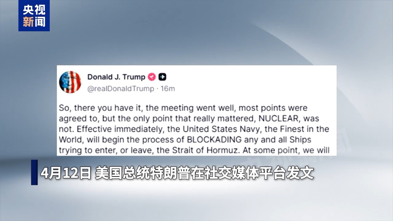 总台记者 李健南:针对本次伊美谈判,美国总统特朗普表示,双方虽然在许多议题上取得进展,但在“核问题”这一核心分歧上未能达成一致。特朗普表示,美国将立即启动对霍尔木兹海峡的海上封锁,阻止任何试图进出该海峡的船只通行。他表示,若局势进一步升级,美国军方已做好采取进一步军事行动的准备。
