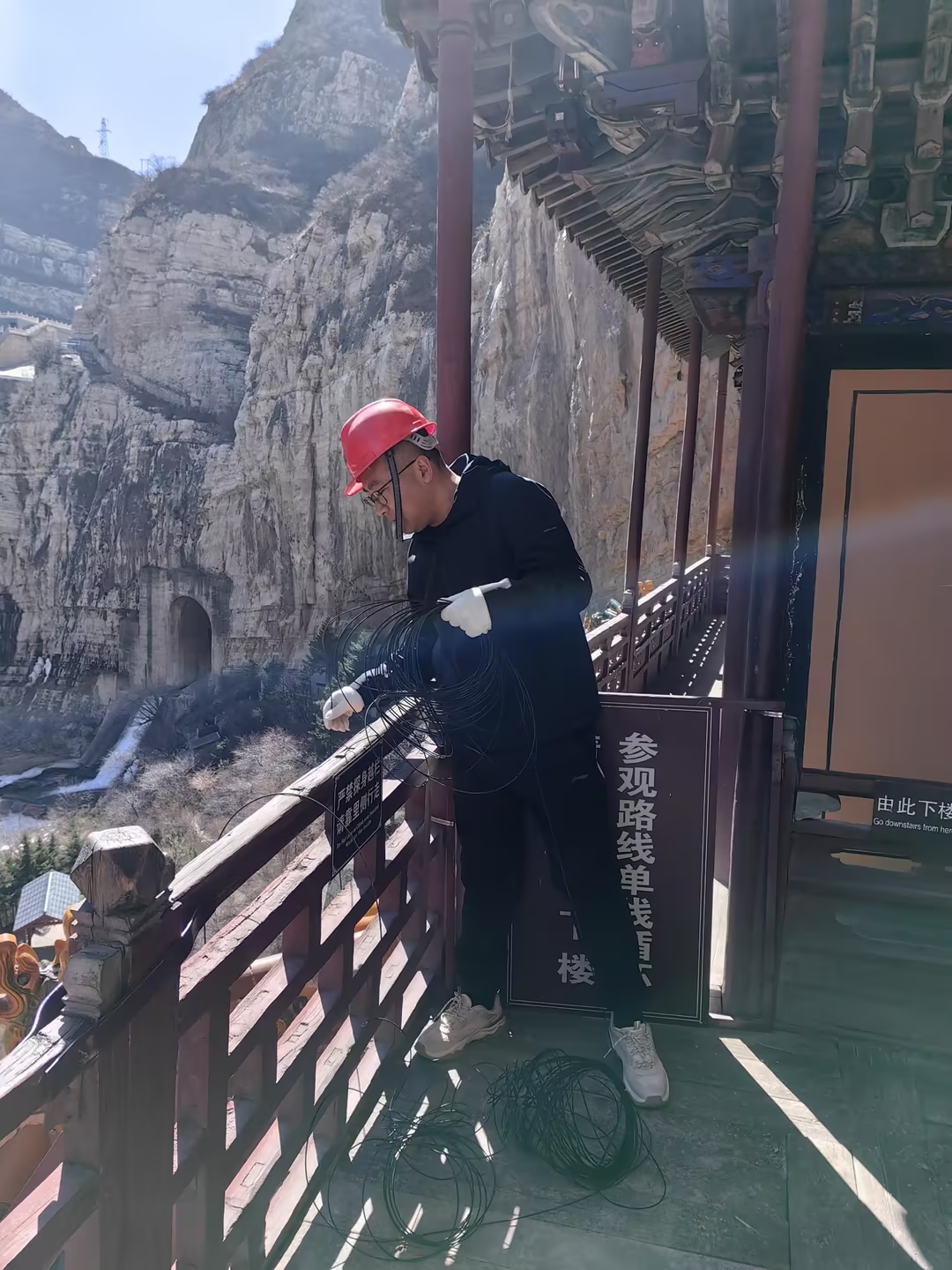 工作人员在悬空寺的栈道和南、北楼的关键梁、柱等核心部位,布设了新型分布式光纤传感网络。曾金艳说:“这一条条光纤,就像给古建植入了一根根传感神经,可以实现对结构振动响应的实时、高精度捕捉。依托光纤技术抗干扰、无损伤的优势,不会对古建造成任何结构破坏。”