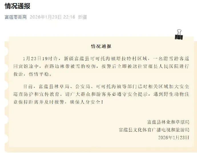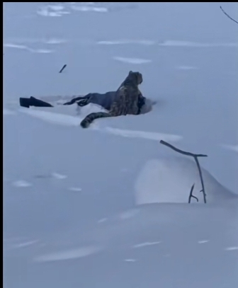 据悉,1月23日晚7时许,一名滑雪游客在返回宾馆途中,于度假区附近路边林带遭遇雪豹袭击,被咬伤后立即报警,并被送往富蕴县人民医院救治。目击者回忆,事发时积雪深达大腿,行动困难。雪豹突然冲出,数秒内扑倒游客。所幸该游客佩戴了头盔,附近多名滑雪者迅速举起滑雪板靠近,并不断向雪豹逼近。雪豹见人群聚集,遂缓缓退离,未继续攻击。