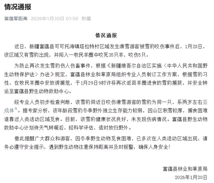 情况通报称,经专业人员初步检查判定,此次捕获的雪豹即为1月23日袭击游客的个体,系一只约两岁的亚成体。专家分析,该年龄段雪豹冬季独立生存能力较弱,加之山区积雪深厚、捕食困难,故冒险进入人类活动区域觅食。目前,该雪豹健康状况良好,无明显伤病。富蕴县野生动物救助中心计划待天气转暖后,经科学评估,适时将其放归野外。