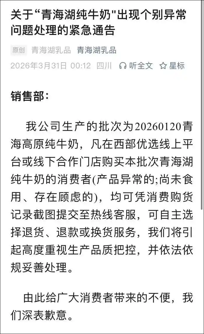 山西晚报·山河+记者注意到,针对此事,涉事企业3月31日通过微信公众号“青海湖乳品”发布说明称,此次异常系生产环节设备故障所致——冲洗用的无菌水误入牛奶包装,且当班工人未及时剔除异常产品。企业强调,该无菌水符合卫生标准,不会对人体健康造成影响。