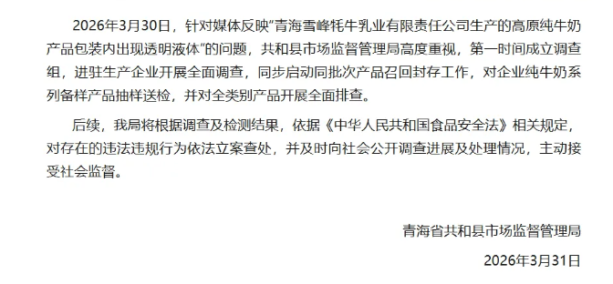 山西晚报·山河+讯 近日,有消费者反映,饮用青海雪峰牦牛乳业有限责任公司生产的“青海湖”高原纯牛奶时,倒出透明苦味液体,连续打开四盒均出现异常,对其产品质量产生严重疑虑。4月1日,山西晚报·山河+记者从青海省共和县市场监督管理局获悉,该局已成立专项调查组,于3月30日晚进驻涉事企业开展连夜核查,并对全类别产品启动全面排查。