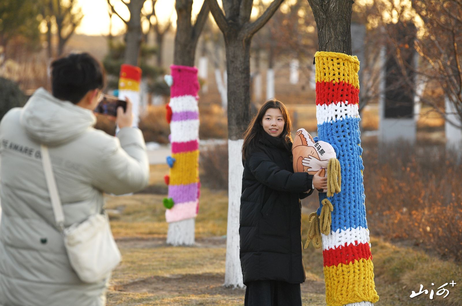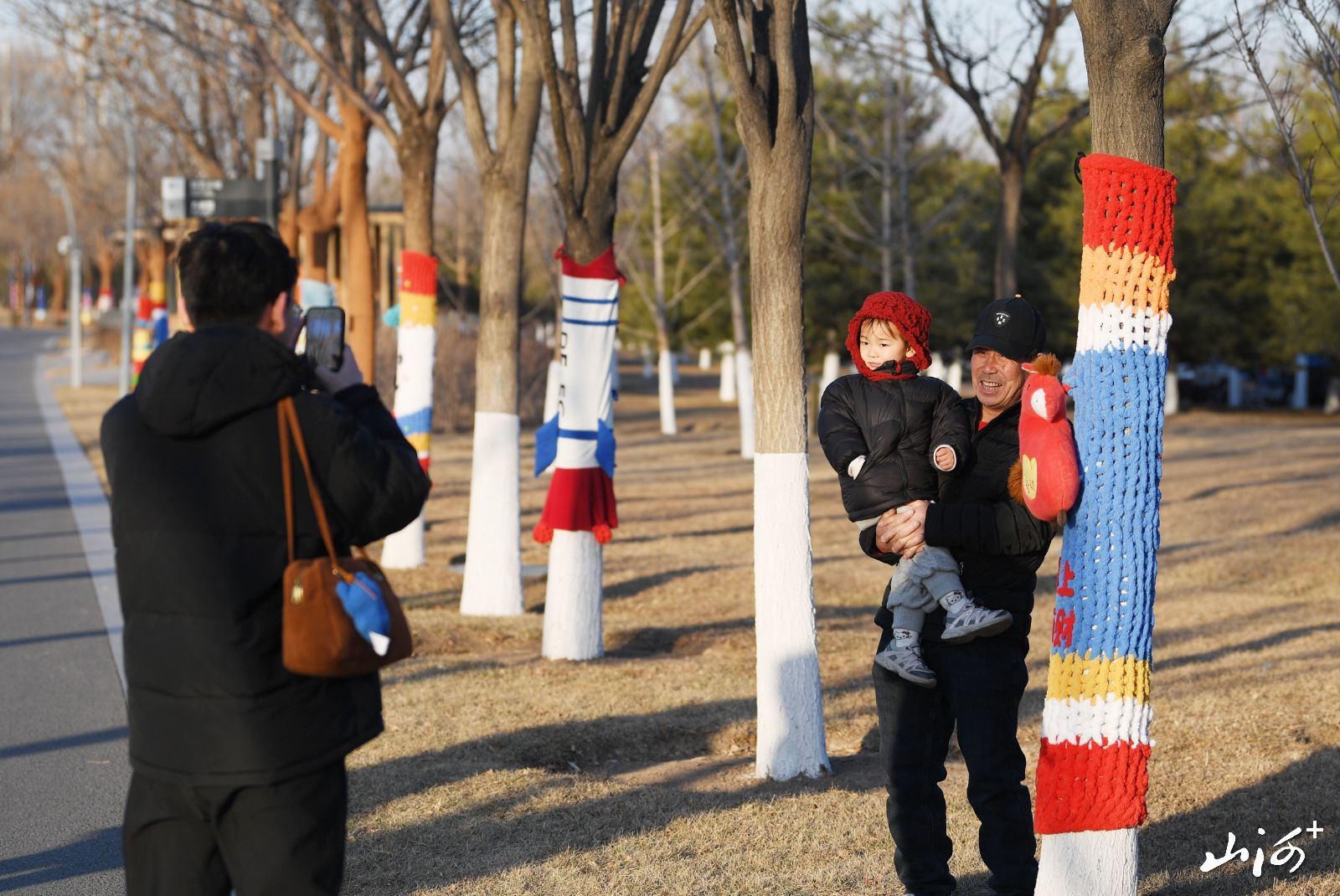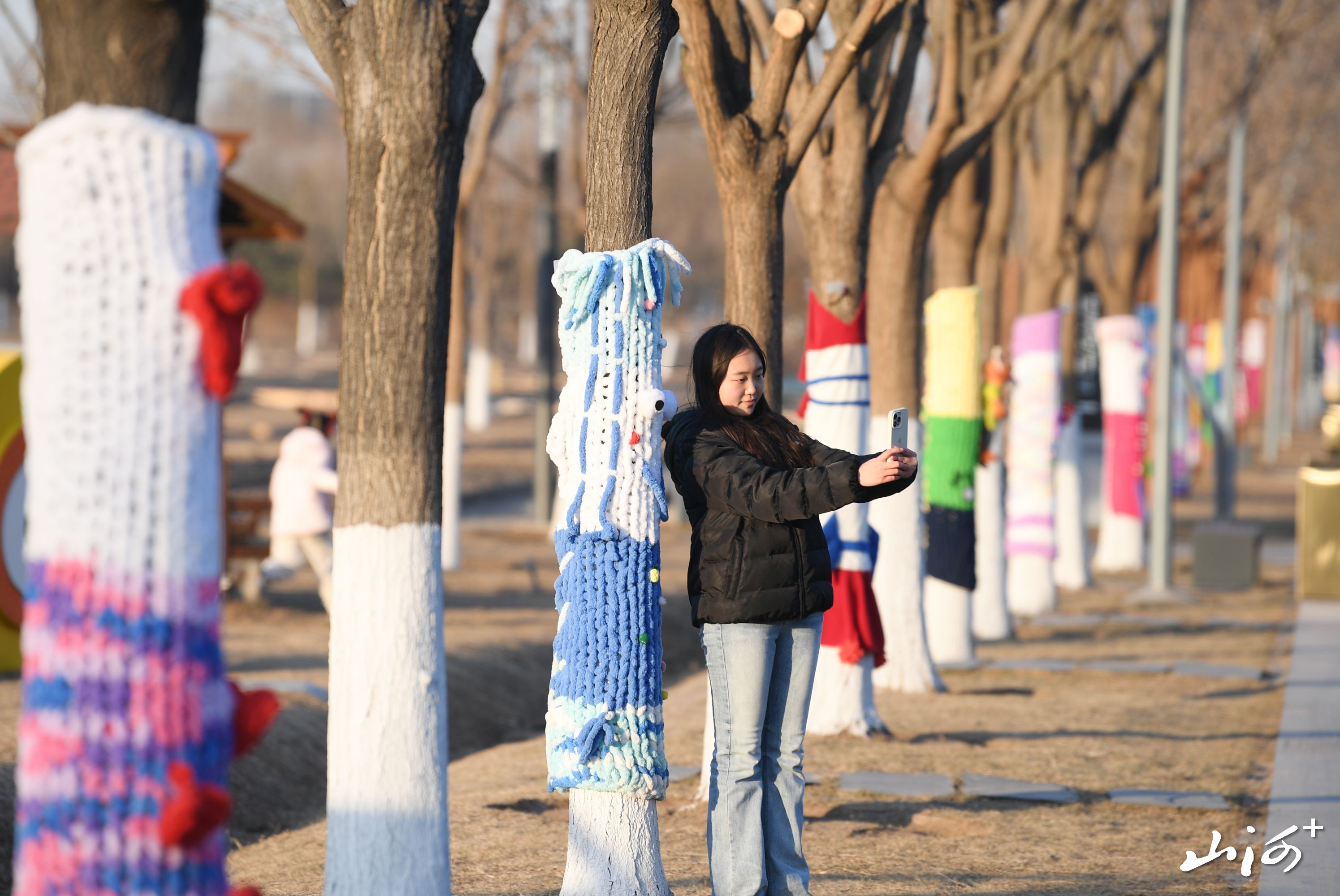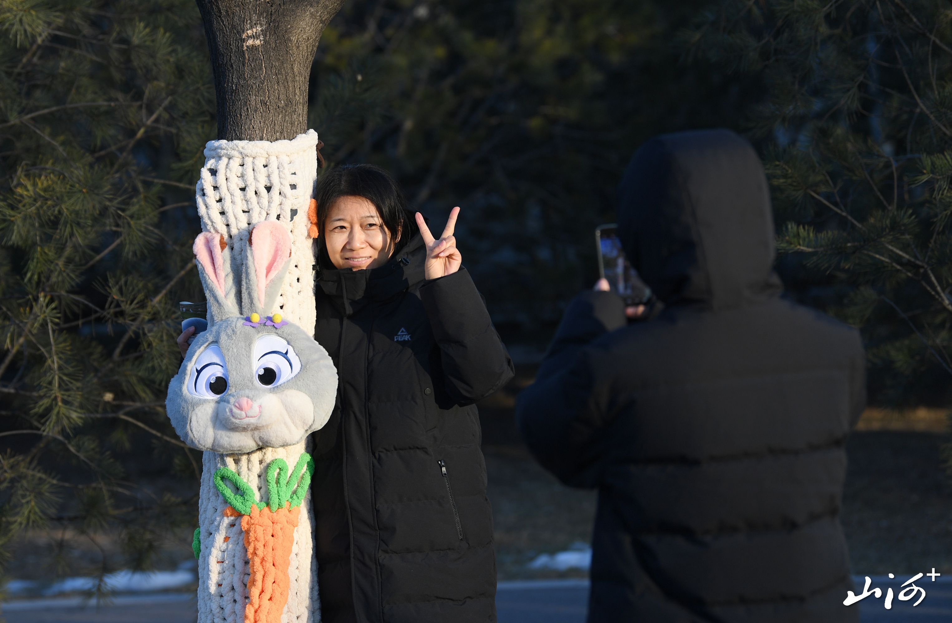 1月11日,在太原植物园,园艺小镇两侧的树木穿上了“毛衣”,吸引了众多游客驻足围观。园内工作人员介绍,为给树木冬季做好养护,他们根据树木品种与特性采取差异化保护措施,确保其安全过冬。