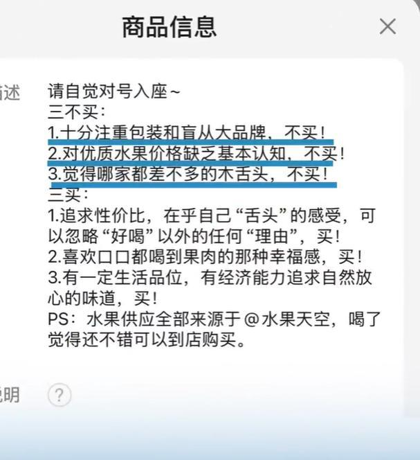 据网友提供的截图显示,在“捣捣果果”小程序“了解更多”栏目中,曾出现一段以“掌柜”口吻撰写的提示文字,要求消费者“自觉对号入座”,并列出“三不买”标准:十分注重包装和盲从大品牌,不买!对优质水果价格缺乏基本认知,不买!觉得哪家都差不多的“木舌头”(意指味觉不敏感者),不买!