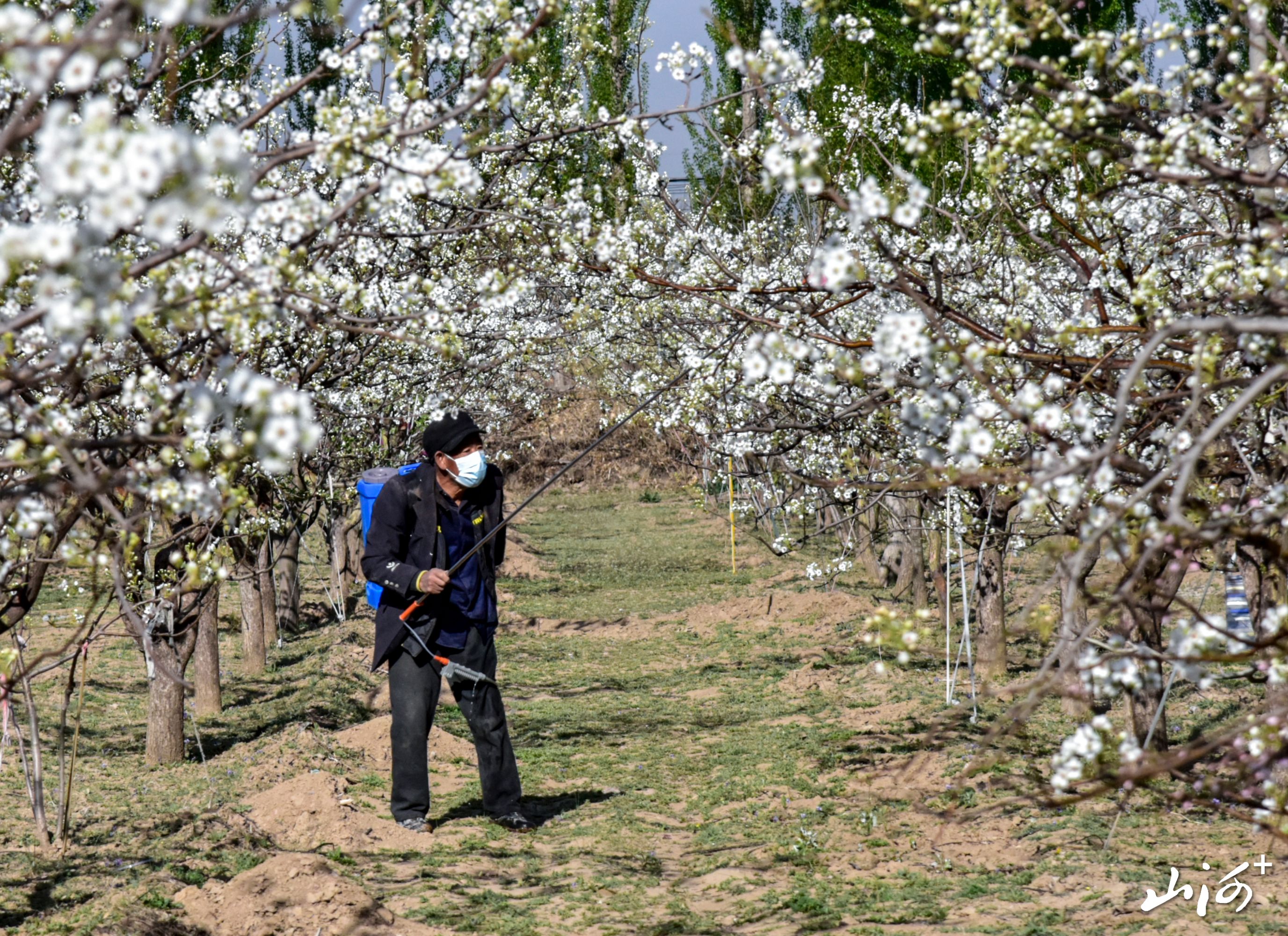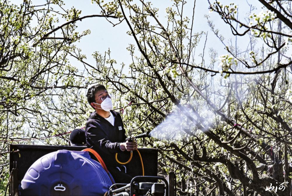 原平市子干乡,果农为开花的梨树喷施管护剂。