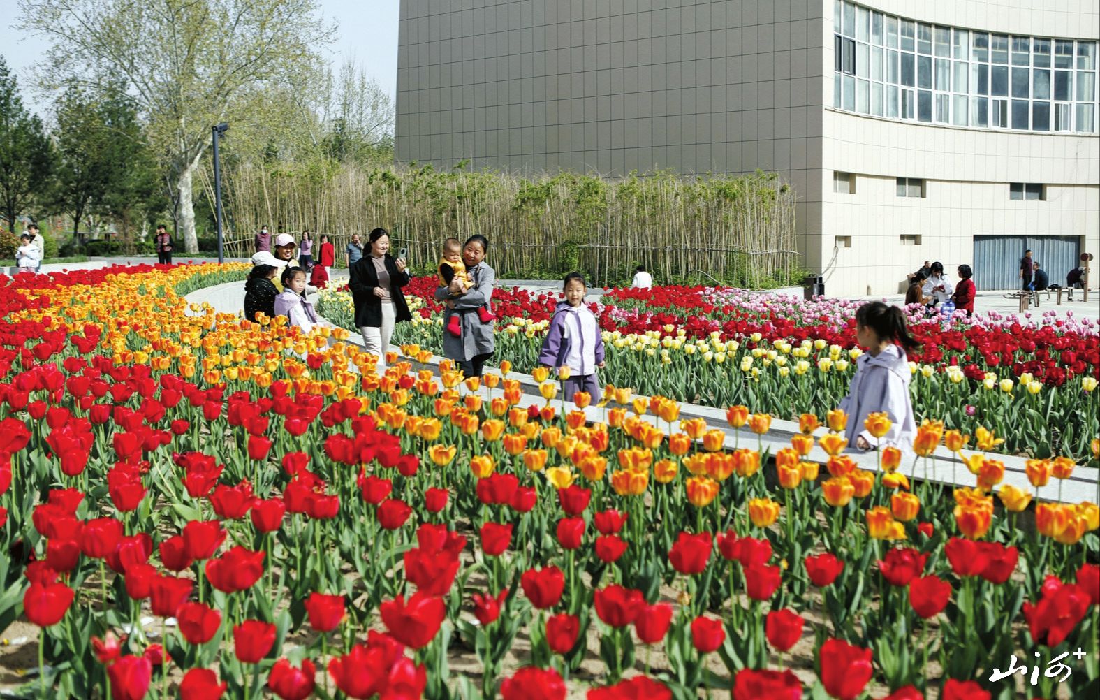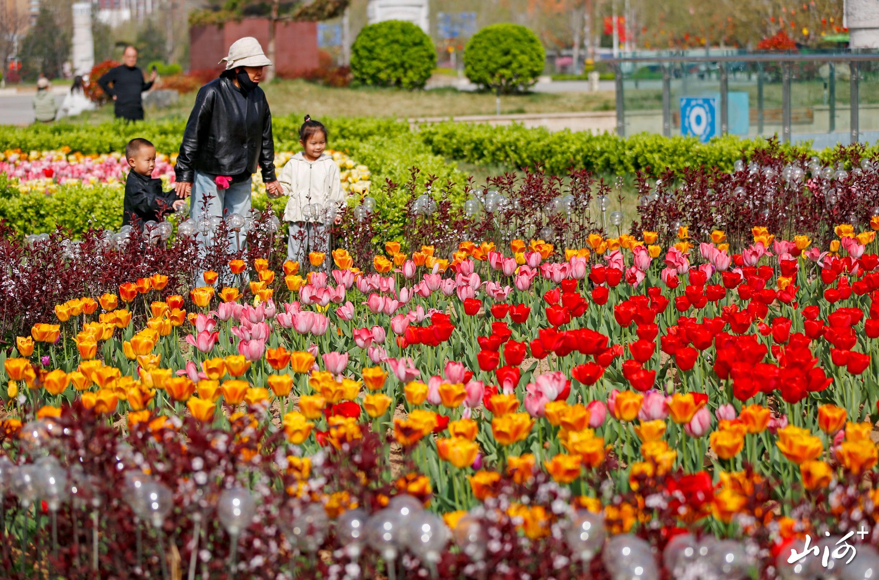 市民在临汾市襄汾县丁陶文化广场赏花游玩。