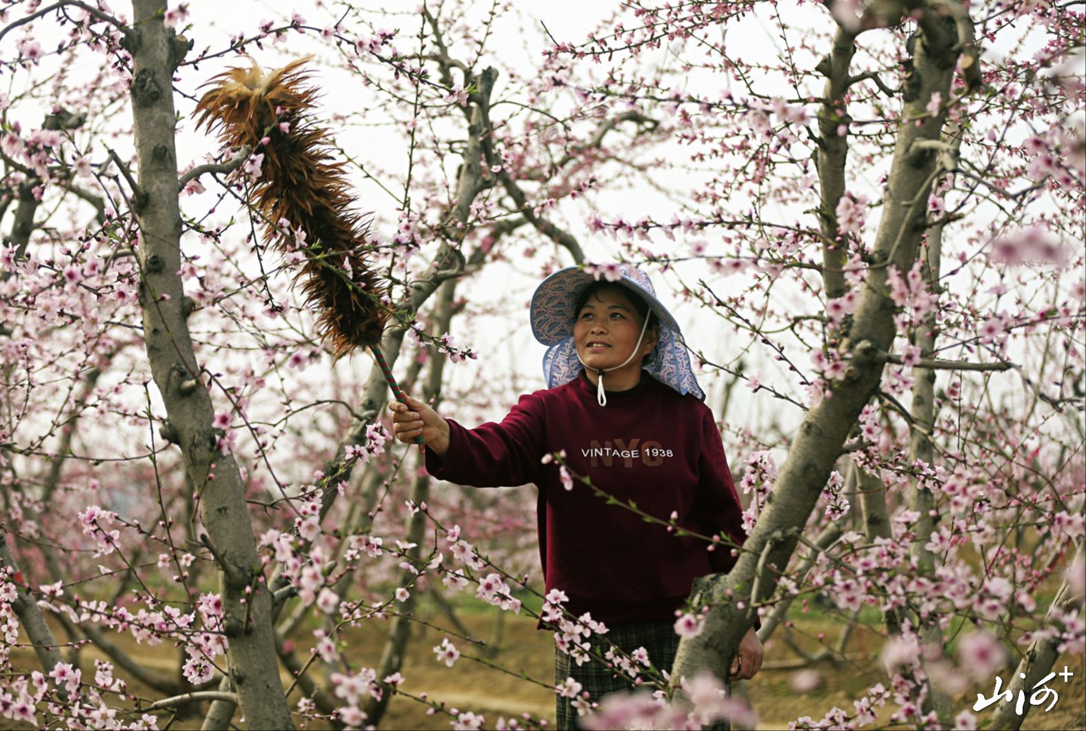 新绛县阳王镇,果农为桃花进行人工授粉。