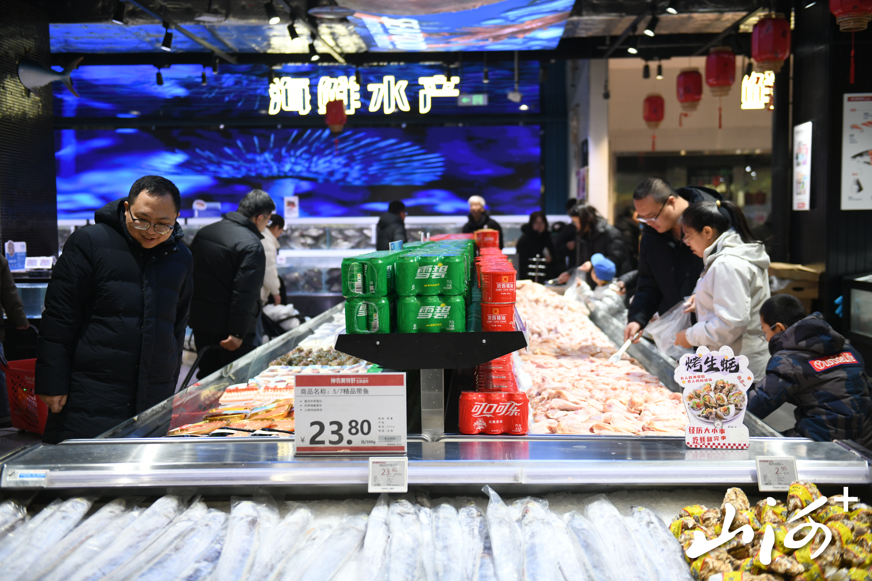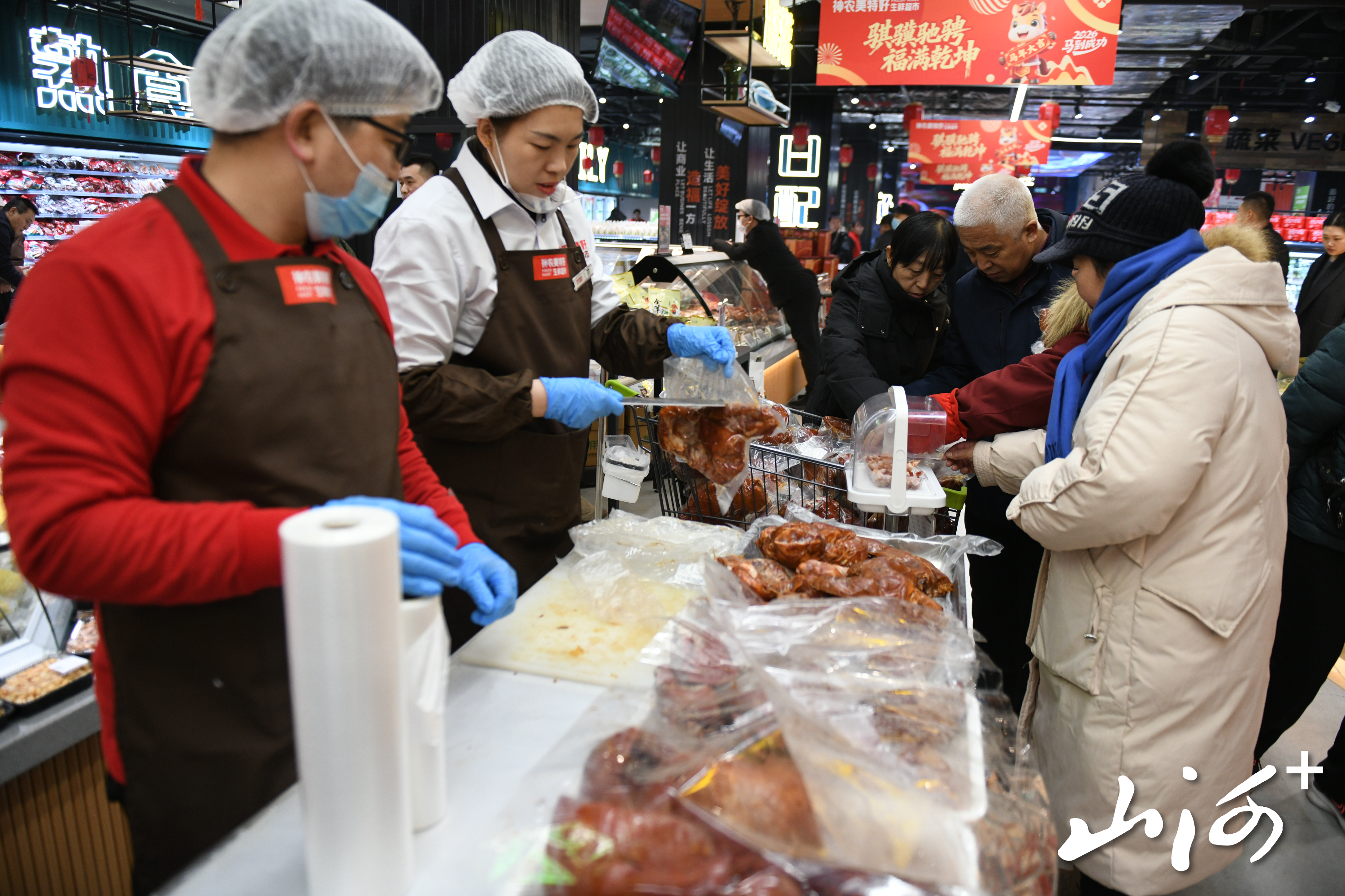 1月26日上午10时,神农美特好双塔东街店,迎来了不少前来选购年货的顾客。在生鲜区域,醒目的价签引来市民选购:甄选鲜蛋30枚一盒仅售9.9元,活鲈鱼13.9元/斤,怀仁带骨羊腿29.9元/斤。“下雪天就怕价格涨,但来这里一看,肉和蛋的价格比雪前还实惠,心里一下就踏实了。”正在排队称重的刘女士说。