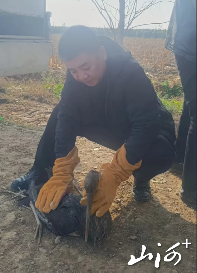 10月28日,枣疙瘩村一村民在田间发现一只体态硕大、行动困难的大型鸟类。该鸟羽毛以黑色为主,嘴长且呈红色,腿部细长,与常见的鸟类有明显区别。该村民第一时间拨打了永济市林业局野生动物救助电话。