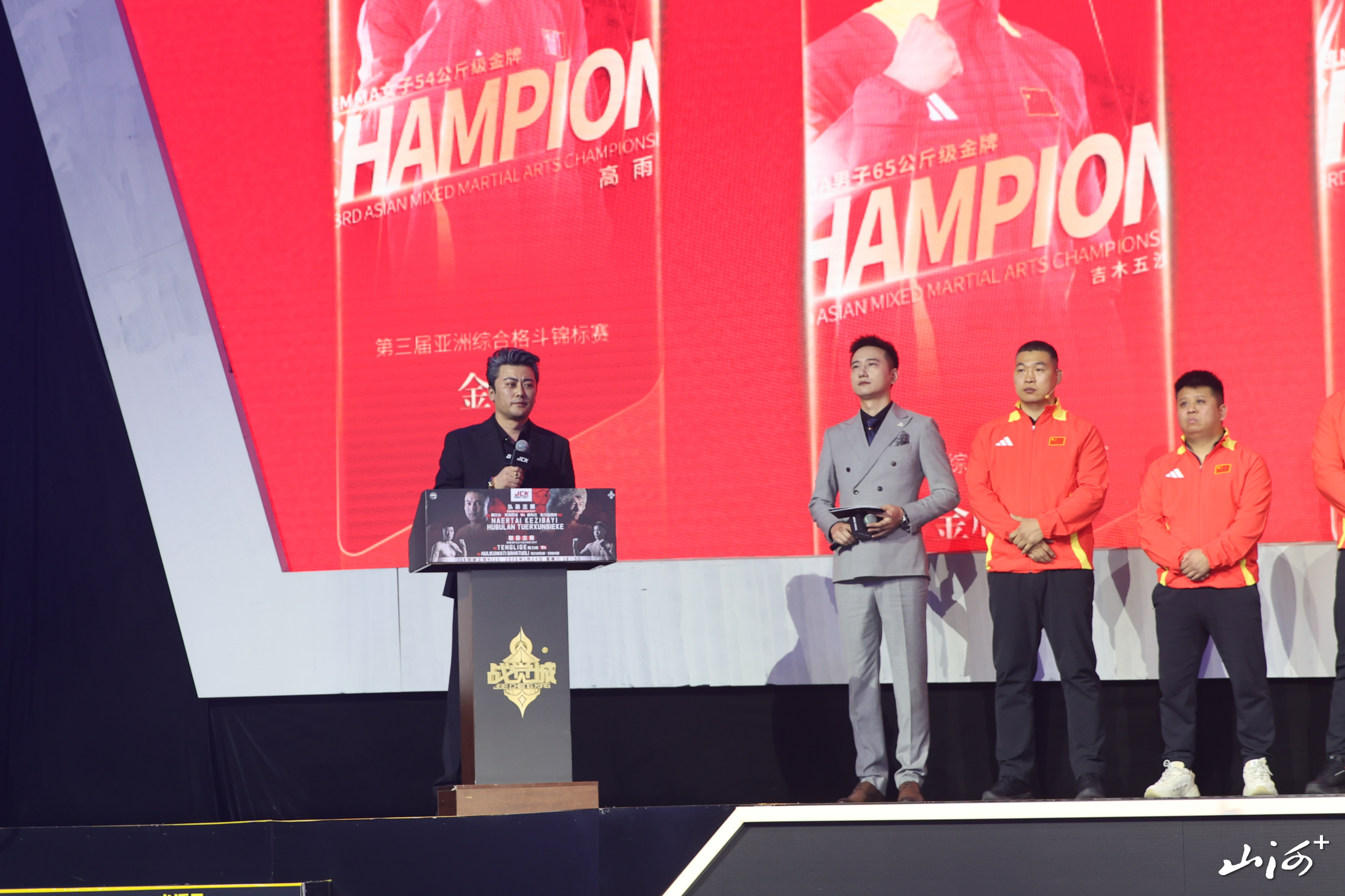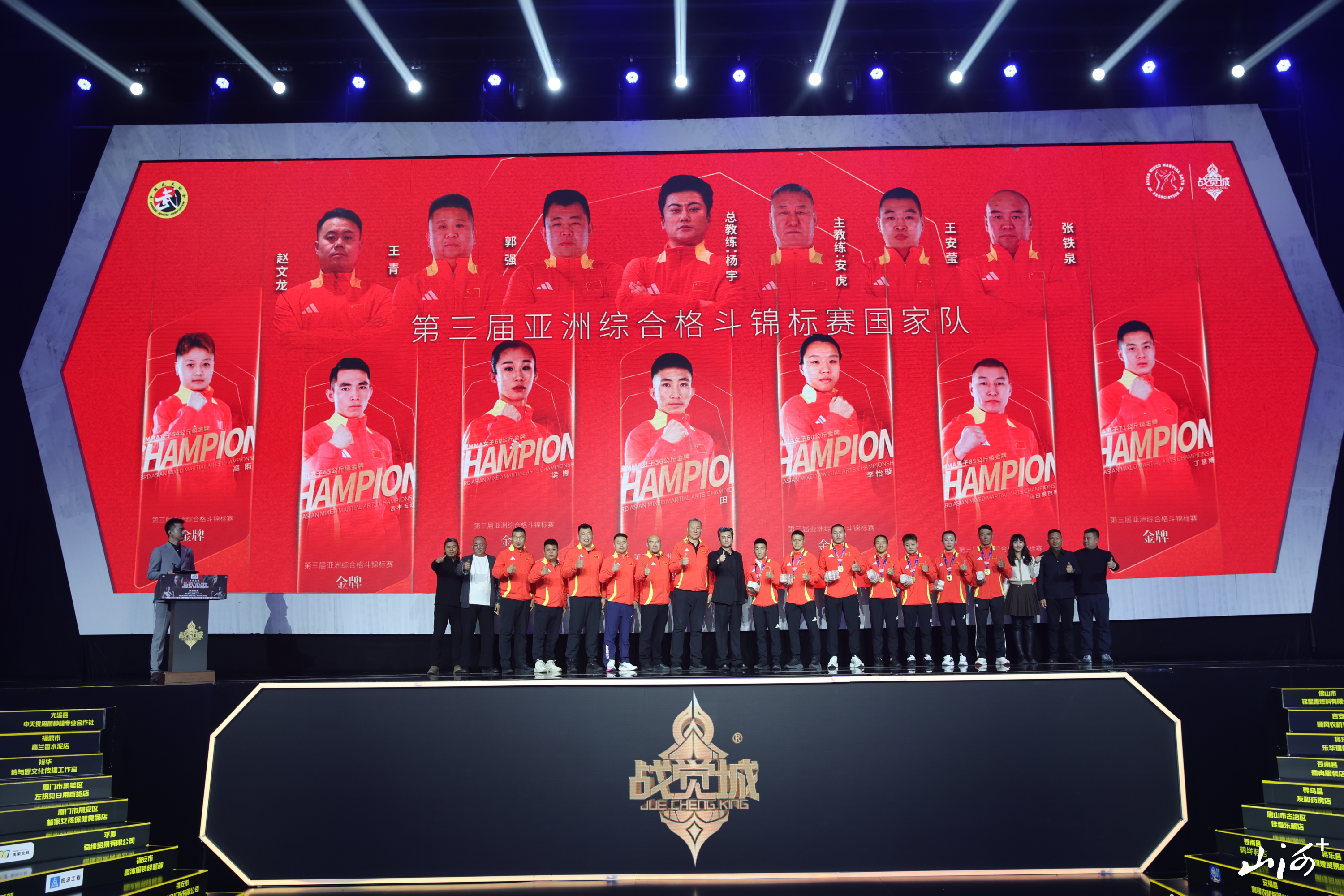 比赛正式开始前,现场举行了一场庄重的颁奖仪式,表彰前不久在第三届亚洲综合格斗锦标赛中夺得金牌的中国队选手。由山西千岁格斗有限公司董事长、JCK战觉城品牌创始人杨宇担任总教练的中国国家综合格斗队,在亚锦赛一举斩获7金4银8铜,强势夺得团体总冠军。
