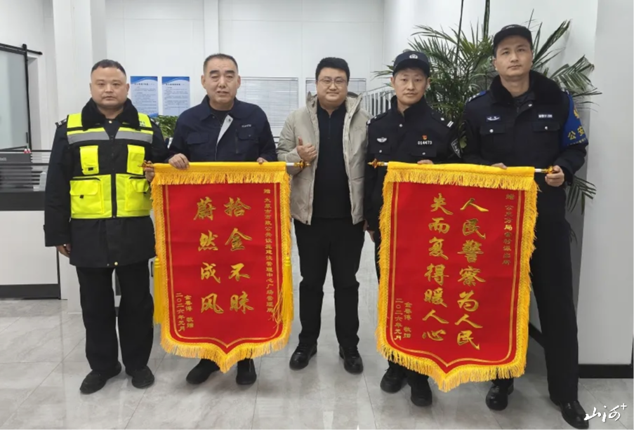 山西晚报·山河+讯  近日,北京市民金先生专程赶到太原市市政建管中心广场管理所,将一面写有“拾金不昧,蔚然成风”的锦旗送到工作人员手中,对他们帮助自己寻回重要证件表示衷心感谢。