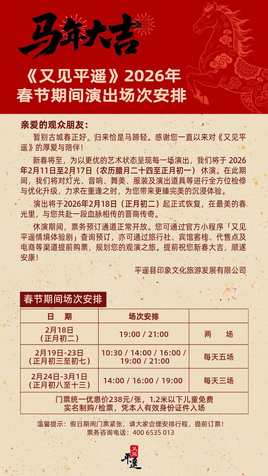 根据安排,演出暂停期为2026年2月11日(农历腊月二十四)至2月17日(正月初一),共计7天。在此期间,演出团队将集中对剧场设备、灯光音响系统、舞美装置及服装道具等进行系统性检修与调试。同时,全体演职人员将投入封闭排练,对剧目情节、表演细节、情感表达进行深度打磨与精益求精的再创作,力求在艺术呈现上实现新的突破。