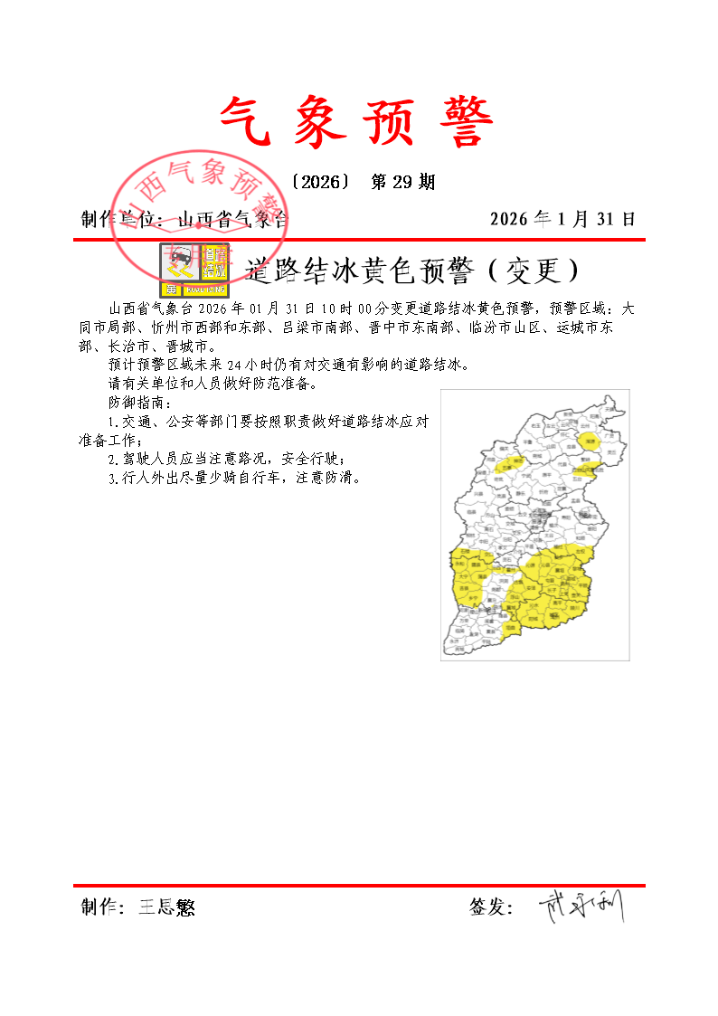 山西省气象台2026年01月31日10时00分变更道路结冰黄色预警,预警区域:大同市局部、忻州市西部和东部、吕梁市南部、晋中市东南部、临汾市山区、运城市东部、长治市、晋城市。预计预警区域未来24小时仍有对交通有影响的道路结冰。请有关单位和人员做好防范准备。