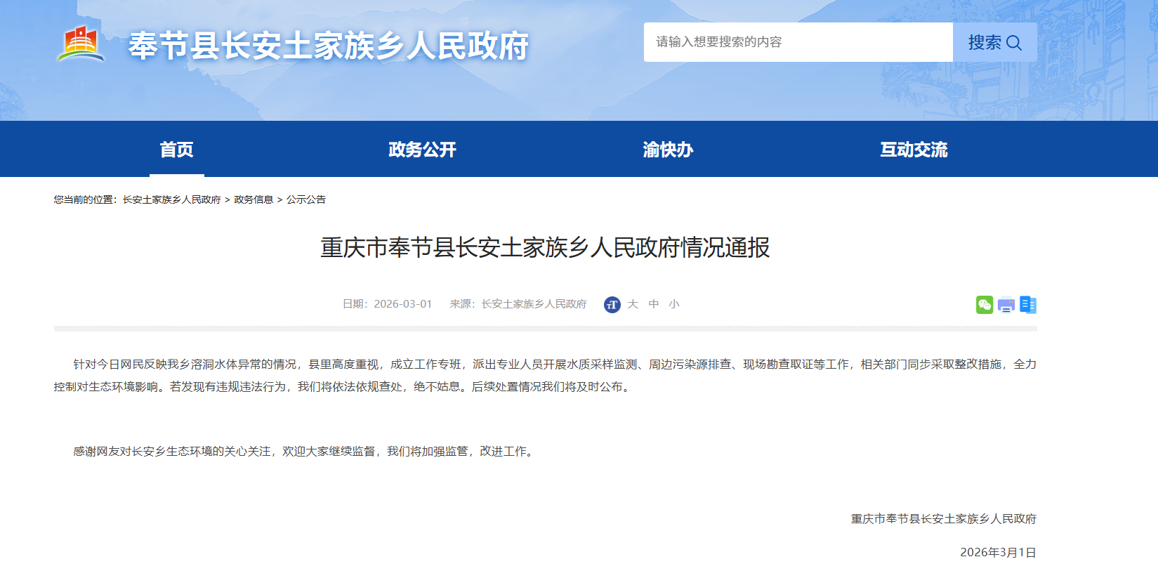 据长安土家族乡政府官网3月1日发布的情况通报,事件发生后,当地已迅速成立工作专班,组织专业人员开展水质采样监测、周边污染源排查及现场勘查取证等工作。相关部门同步采取应急整改措施,全力控制污染扩散,最大限度降低对生态环境的影响。