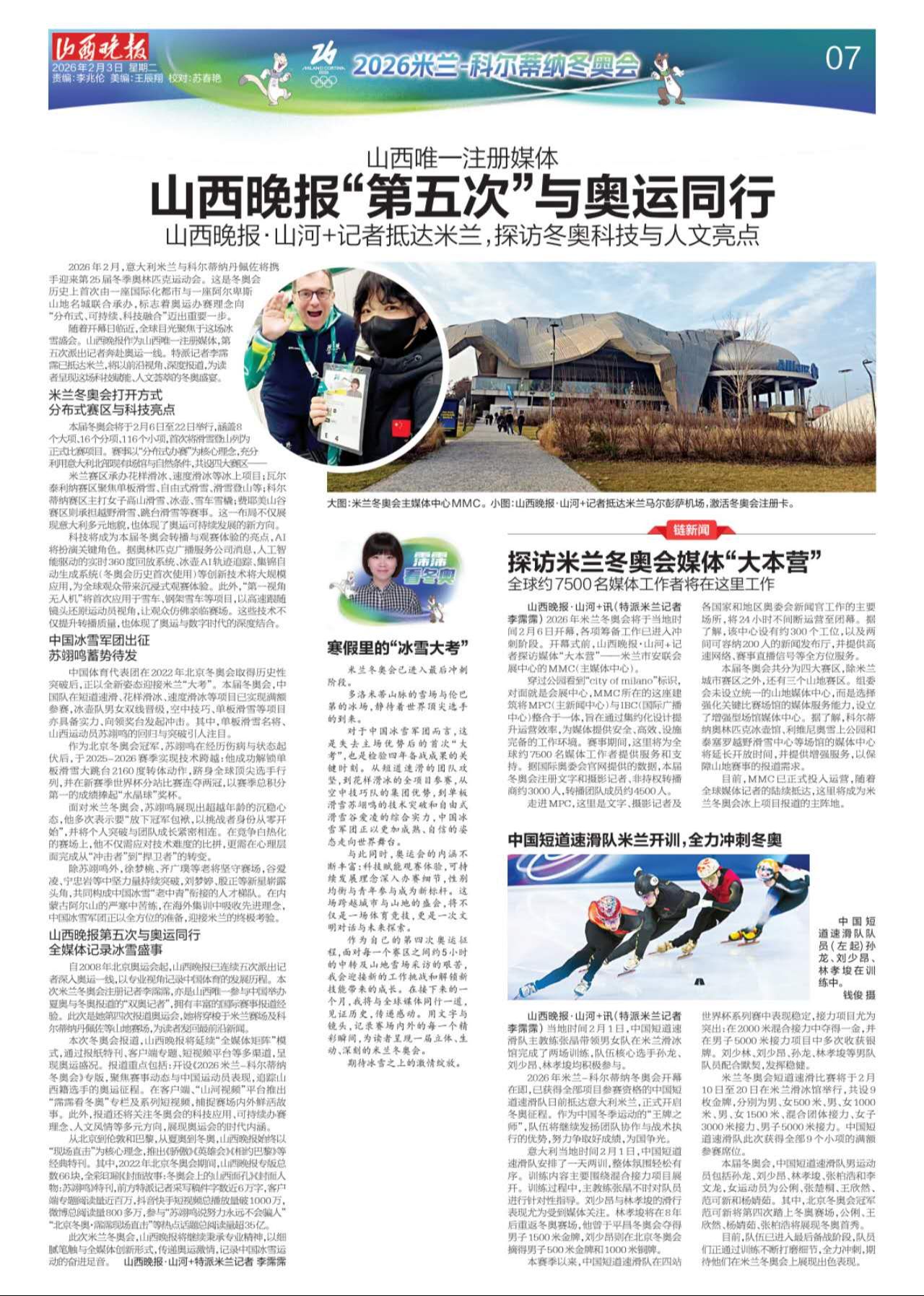 随着开幕日临近,全球目光聚焦于这场冰雪盛会。山西晚报作为山西唯一注册媒体,第五次派出记者奔赴奥运一线。特派记者李霈霈已抵达米兰,将以前沿视角、深度报道,为读者呈现这场科技赋能、人文荟萃的冬奥盛宴。