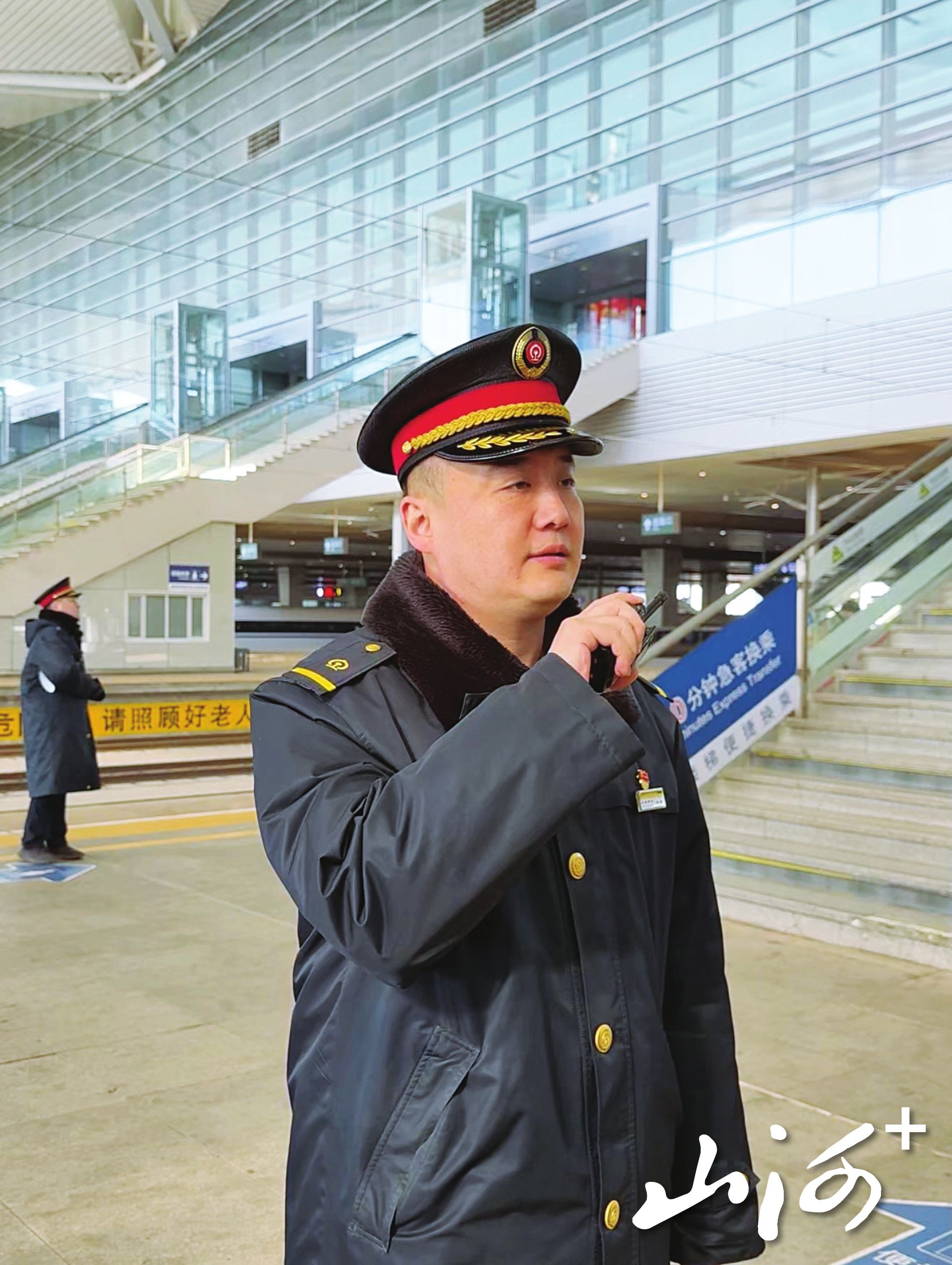 商务候车厅与站台,虽相距不远,却被忙碌的客流隔成了两个“战场”,大年初一的早晨,夫妻俩连见一面的时间都没有。就连新年的第一顿早餐,都是各自在岗位附近的休息室匆匆解决,一杯热豆浆、几个包子,简单却踏实。“我们早就习惯了,他在站台忙,我在贵宾厅忙,知道彼此都在坚守,都平平安安,就是最好的新年默契。”郭韬趁着旅客休息的间隙,和记者聊起家常,短发下的眉眼温柔又坚定。赵杨在站台的间隙也笑着说:“她细心,守贵宾厅我放心,我守站台,让她和旅客都安心。大年初一,一起守岗,就是我们最特别的新年过法。”