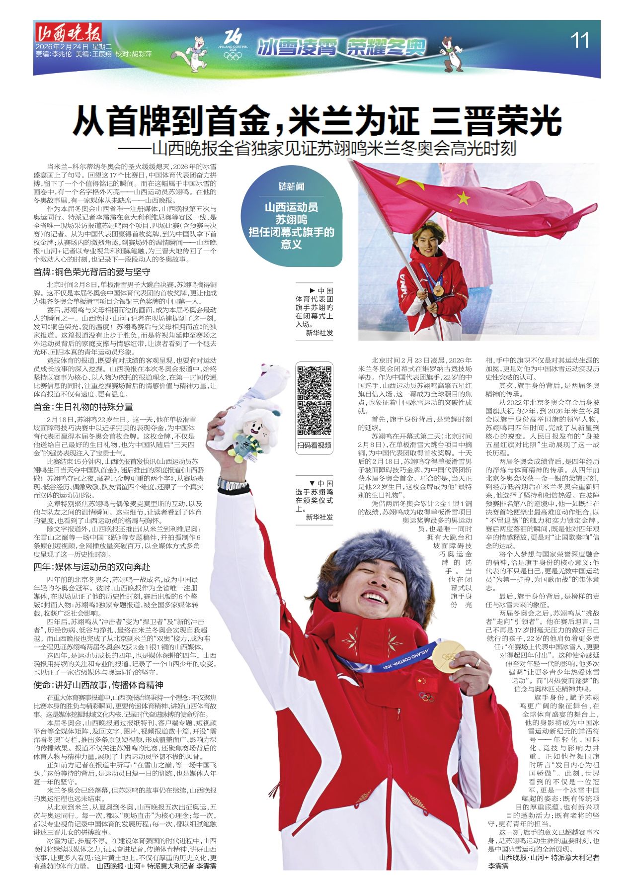 当米兰-科尔蒂纳冬奥会的圣火缓缓熄灭,2026年的冰雪盛宴画上了句号。回望这17个比赛日,中国体育代表团奋力拼搏,留下了一个个值得铭记的瞬间。而在这幅属于中国冰雪的画卷中,有一个名字格外闪亮——山西运动员苏翊鸣。在他的冬奥故事里,有一家媒体从未缺席——山西晚报。