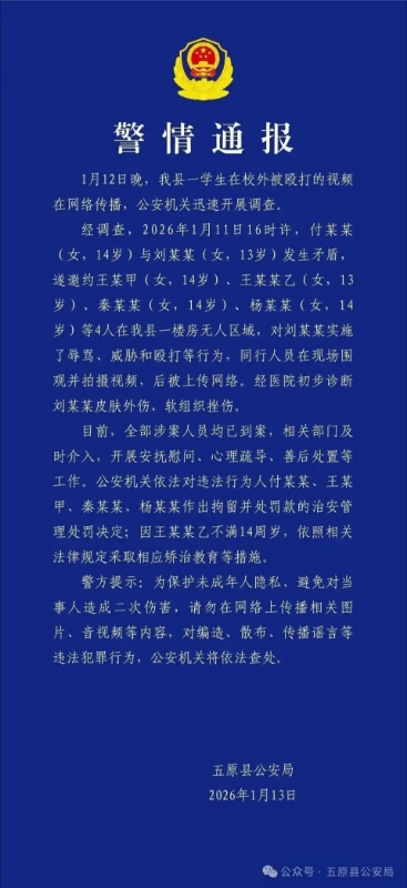 据内蒙古五原县公安局警情通报:经调查,2026年1月11日16时许,付某某(女,14岁)与刘某某(女,13岁)发生矛盾,遂邀约王某甲(女,14岁)、王某某乙(女,13岁)、秦某某(女,14岁)、杨某某(女,14岁)等4人在我县一楼房无人区域,对刘某某实施了辱骂、威胁和殴打等行为,同行人员在现场围观并拍摄视频,后被上传网络。经医院初步诊断刘某某皮肤外伤、软组织挫伤。