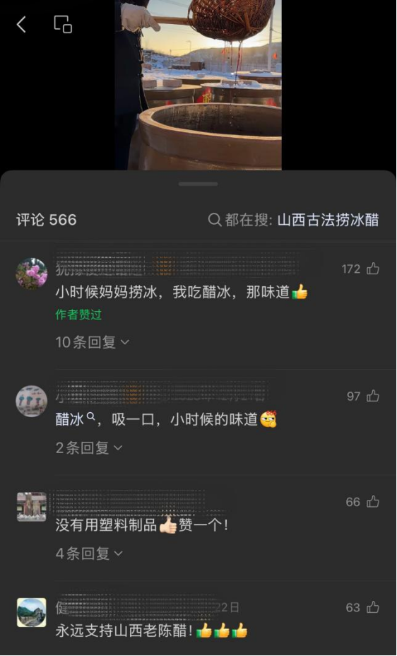 “给大家看一看我们山西人的醋宝贝,100斤新醋捞到最后就剩30多斤精华!”牛三忠对着镜头向网友娓娓道来,牛子群蹲在一旁,用手机拍下父亲捞冰的视频。短视频发布在社交媒体平台后,引来网友纷纷留言:“这浓缩的可不是一般的酸爽,是时光的味道!”