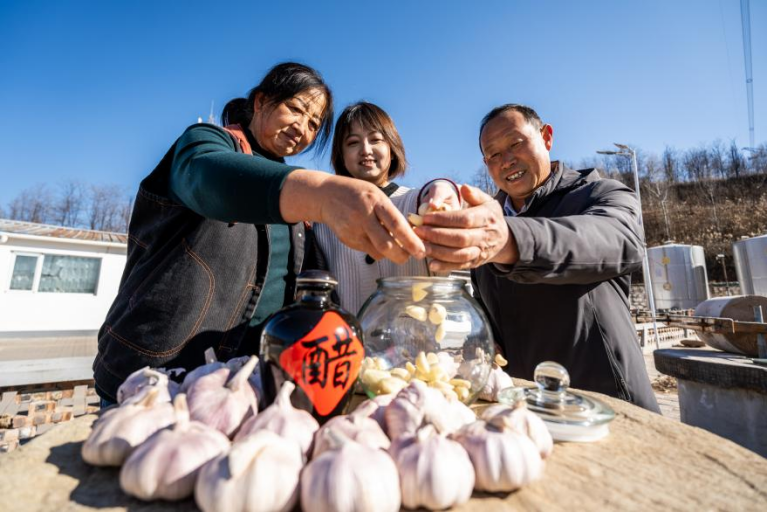 眼看春节要到了,牛三忠早早备好了捞冰醋,准备和妻女腌制腊八蒜。一阵剥皮的“沙沙”声后,剥好的蒜瓣儿整齐地码进空坛子,捞冰醋顺着坛壁缓缓淌入蒜粒缝隙。