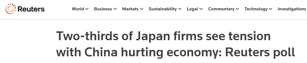 路透社1月15日公布的一项调查显示,超过三分之二的日本企业预计,日中关系紧张将对日本经济造成冲击,近一半企业已经感受到或预计将面临直接的经营冲击。