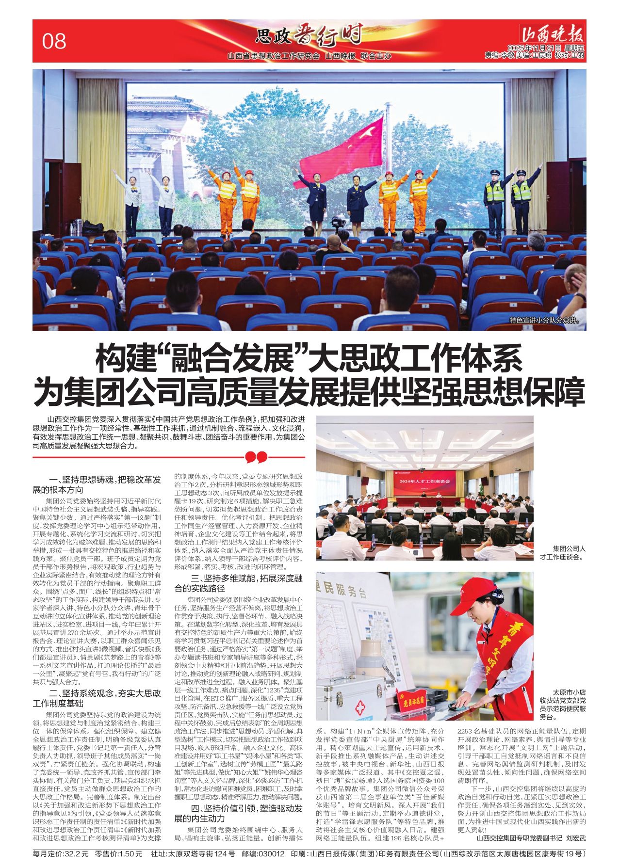 山西交控集团党委深入贯彻落实《中国共产党思想政治工作条例》,把加强和改进思想政治工作作为一项经常性、基础性工作来抓,通过机制融合、流程嵌入、文化浸润,有效发挥思想政治工作统一思想、凝聚共识、鼓舞斗志、团结奋斗的重要作用,为集团公司高质量发展凝聚强大思想合力。