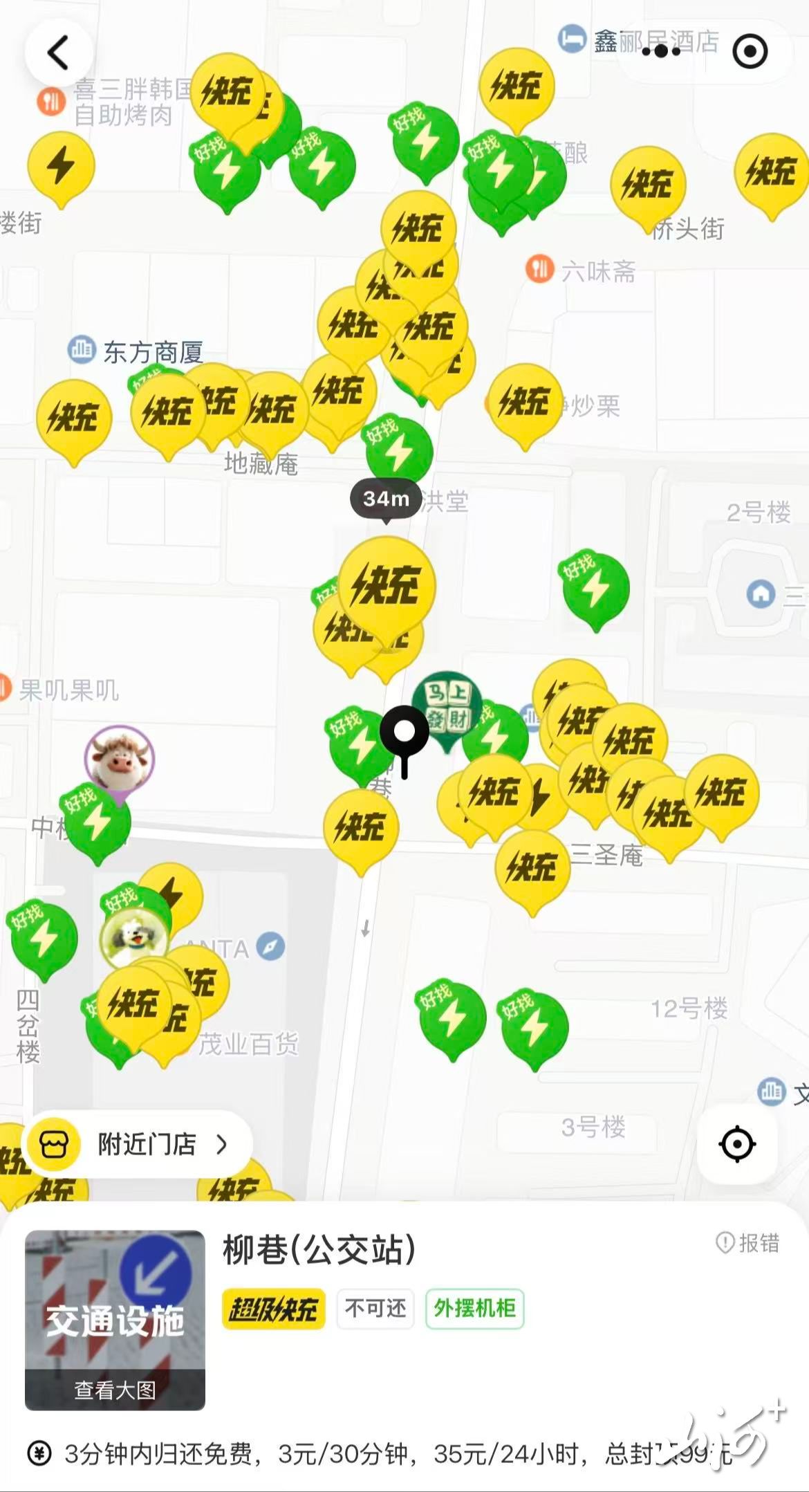 在柳巷商圈多家连锁餐饮、奶茶店及商场内,共享充电宝设备摆放位置显眼,计费规则均在机身及扫码页面明确标注。普通商圈与餐饮场所普遍执行3元/小时的计费标准,部分点位为3.5元/小时,多数品牌设置前5分钟免费试用,也有品牌设置前3分钟免费试用。24小时封顶价格在30元至35元之间。一名奶茶店店员告诉记者,店内的共享充电宝设备于2026年春节后完成调价,此前长期执行2.5元/小时或3元/小时的价格,封顶价也多在25元左右,如今不仅单价上调,封顶价格也同步提高。