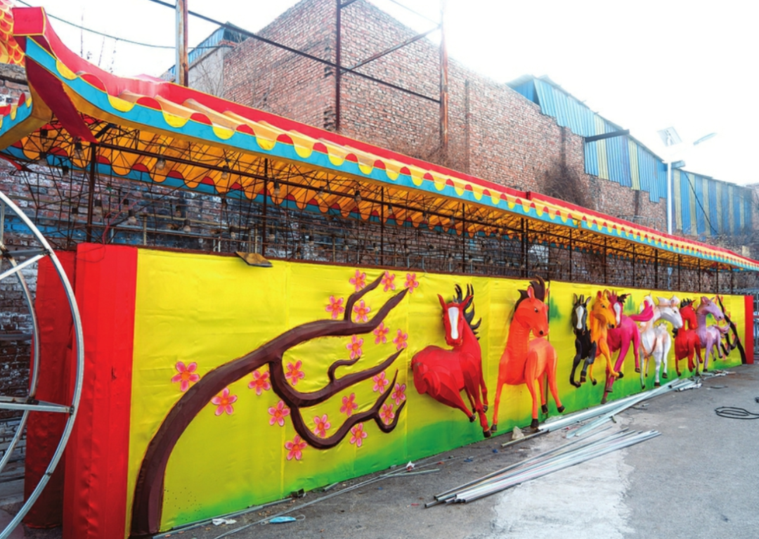 2月14日,记者走进鸿鼎花灯厂,焊花跳跃在花灯骨架间,绸布于巧手中服帖定型。工人们手脚麻利、配合默契,正忙碌地完成着订单上的任务。总经理赵竹青兴致勃勃地在厂房里介绍着每个环节:“花灯设计的流程先是设计图纸,然后是焊接、接灯、裱糊、上色,最后是成品展示。”