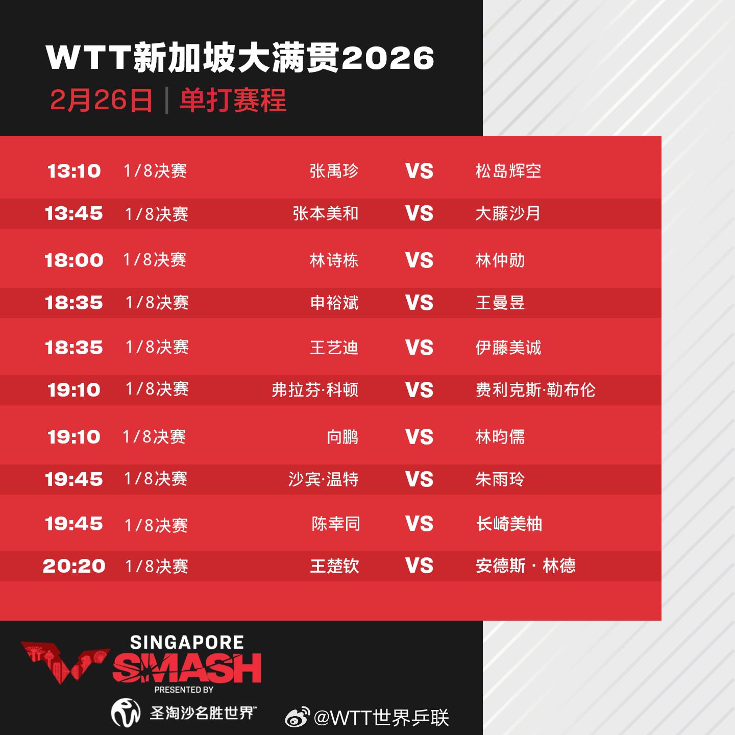 2026年WTT新加坡大满贯精彩继续,经过4个正赛日的争夺,孙颖莎、王曼昱、王楚钦等11名国乒选手晋级单打16强。26日将进行男女单打1/8决赛及双打半决赛,其中将上演3场“中日对决”,具体赛程如下: